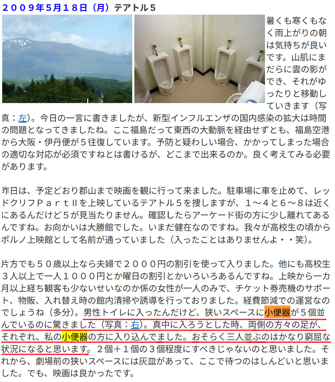 最新の日記 2026年2月24日 3月が迫る 今日の一言:次の日曜は水戸オフで月曜は先生方への説明会だ。3月だからと余裕こいてたけど近づいてきた。 缶の珈琲豆が少なく備蓄を確認したら大袋がまだ2つあり豊かな気分になる。猫砂でもクリクラの水にしても在庫がある余裕が良いよね。起きがけのラジオでリスナーからの投稿で特徴ありトイレが紹介されていた。過去に日記に書いたことがあったとなとググったら21年前(画像)だった。レッドクリフPartⅡを観たんだった。リン・チーリンが美しかった。アキラさんの奥様だね。 続きを読む → 今月の一覧 過去日記