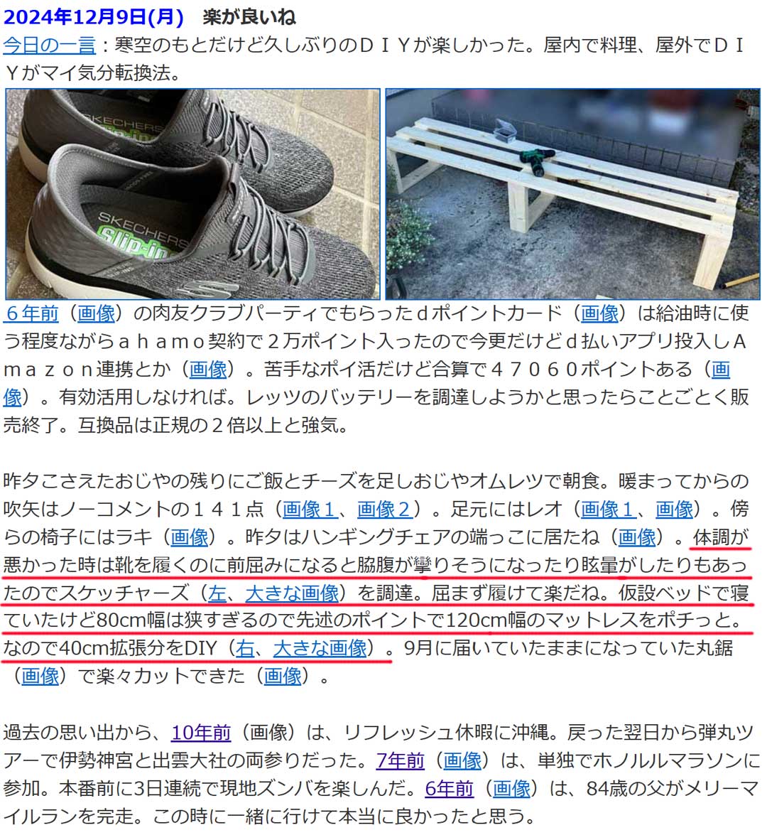 過去の思い出から、1年前(右、大きな画像)は、スケッチャーズスリップインズを上履きに購入。前屈みになると脇腹が攣りそうになったり眩暈がしたりしてたのが改善されて楽になった。脇腹と言えば、車でバックする際に後方確認で振り返ると脇腹が攣りそうになる。なんか人間として柔軟性に難ありだと思う。80cm幅の折り畳み式簡易ベッドをDIYで40cm拡げたりもしていた。接続部分に微妙な段差を感じつつ1年が経過してしまった。年内に調整したい。