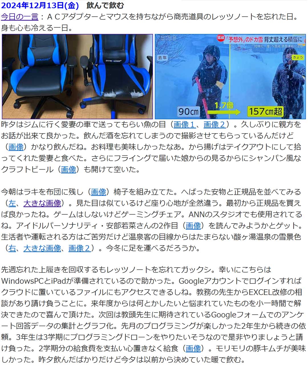 地元に戻りガソリン給油。144円/Lとまた安くなっていた。外はめっちゃ冷え込んでいて珍しく震えた。帰宅して愛妻の車で初の焼き鳥店でフライングの誕生日祝い。美味しかったけど店が寒く早々に退散。過去の思い出から、1年前(右、大きな画像)は、本物の椅子を新調(画像)。安物買いの銭失いとはよく言ったものだね。日常的に使用する物はケチらないようにしたい。乃木坂46のオールナイトニッポン3代目の井上和さんが座っているのも同メーカーのもの(画像)。
