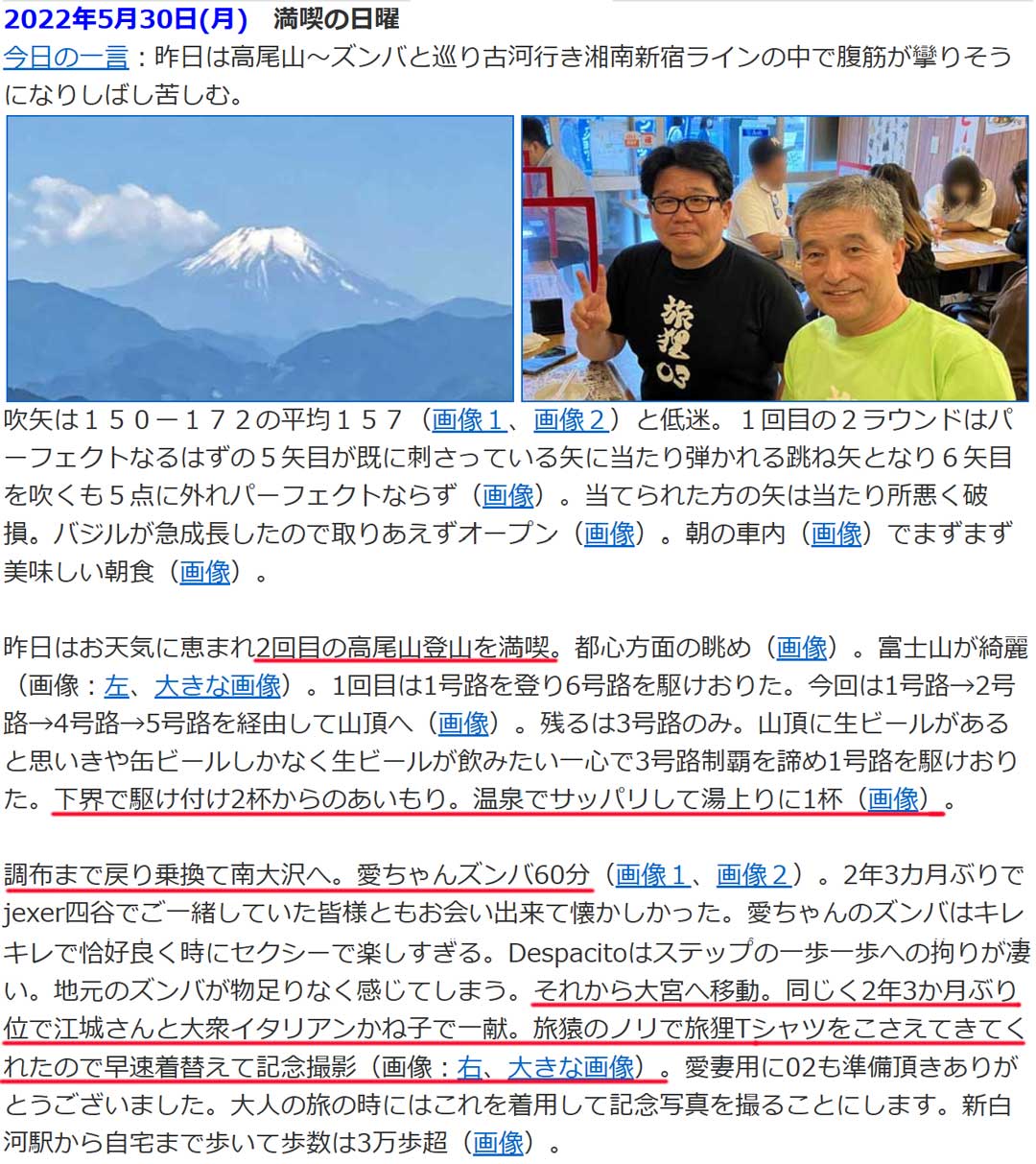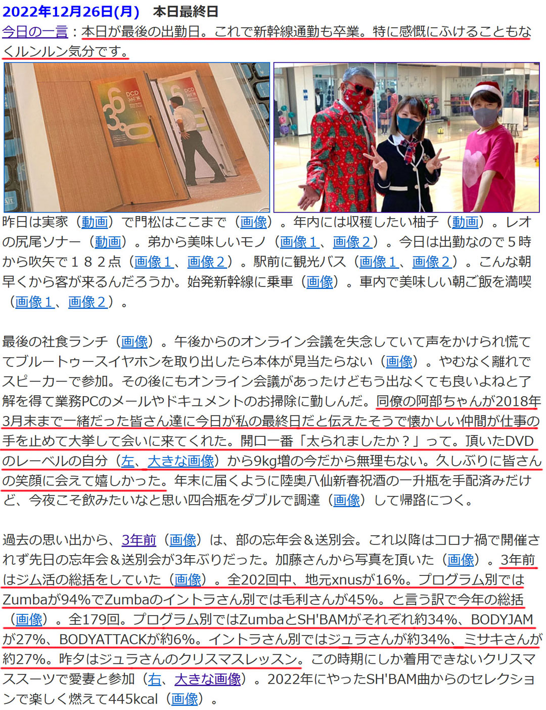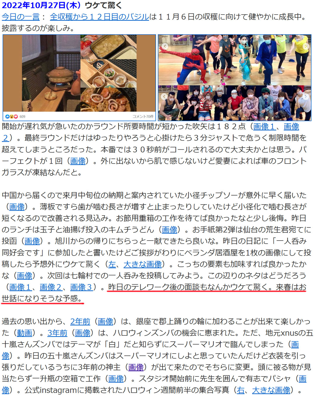 過去の思い出から、3年前(右、大きい画像)は、再雇用4年間の出社最終日。3年のはずが乞われるまま1年延長したものの、テレワーク主体の日々に、もう十分かなと感じていたので、未練や思い残すことはありませんでした。そんな中、同僚の阿部ちゃんの計らいで、かつての部署の皆さんが会いに来てくれて、最後に温かい思い出となりました。当時は「蛇足の1年」という気がしていましたが、今振り返れば、その1年があったからこそ、現在の仕事の求人タイミングと巡り合い、その情報に気づくことができたのです。メール履歴を紐解くと、10月26日に面談へ伺っていたようです。詳しくは書かれていませんが、翌日の日記(画像)の赤線部がまさにそれ。「来春はお世話になりそうな予感」が的中したわけですね。また、ジュラさんのシバムが最高に楽しかった頃でしたね。まさか無くなるとは思いませんでした。