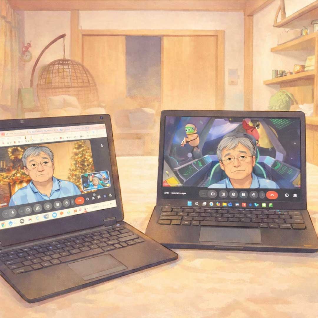 授業無しで安泰かと思いきや相談事が舞い込むも頼りにされるのは嬉しい。次週も3つの予約案件。給食(画像)。季節だからかネギ入りが続いてる。、2学期(25Q4)の支援日は今日を含めあと6日。次週のクリスマスイブが最終日。少し早いけどあっという間の1年間だった。風呂の蓋の上で待つ猫達の写真(画像)をイラスト風にしてみた(右、大きな画像)。最近になってChatGPT君も腕を上げたね。という訳で、昨日の日記の2台のPCでGoogle Meetとホノルルマラソンの思い出の写真をイラスト風に変えてみた。あれこれ思いつくままに予定を入れたら、3学期(26Q1)が凄いことになってきた。