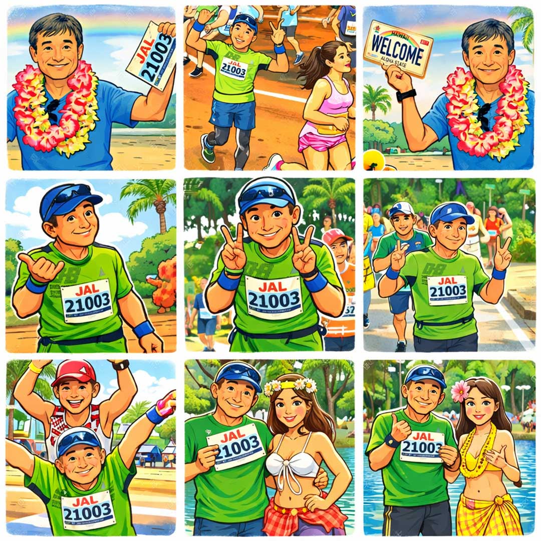 アイドルの話題が多いけど、ラジオパーソナリティの語りを聴くと親近感が湧く方もいる。Googleアプリ検証に使えるかと追加アカウント作成。ChromeOS Flex版のCF-RZ8とVAIOとMeet(左、大きな画像)。Google Workspace for Education下での挙動とは異なる部分もあるけど、Classroomの検証もできるね。過去の思い出から、8年前は、一人で参加した2回目のホノルルマラソンの余韻に浸っていた思い出の画像をイラスト風にしてみた(右、大きな画像、オリジナル)。今でも鮮やかに蘇る素晴らしい記憶。