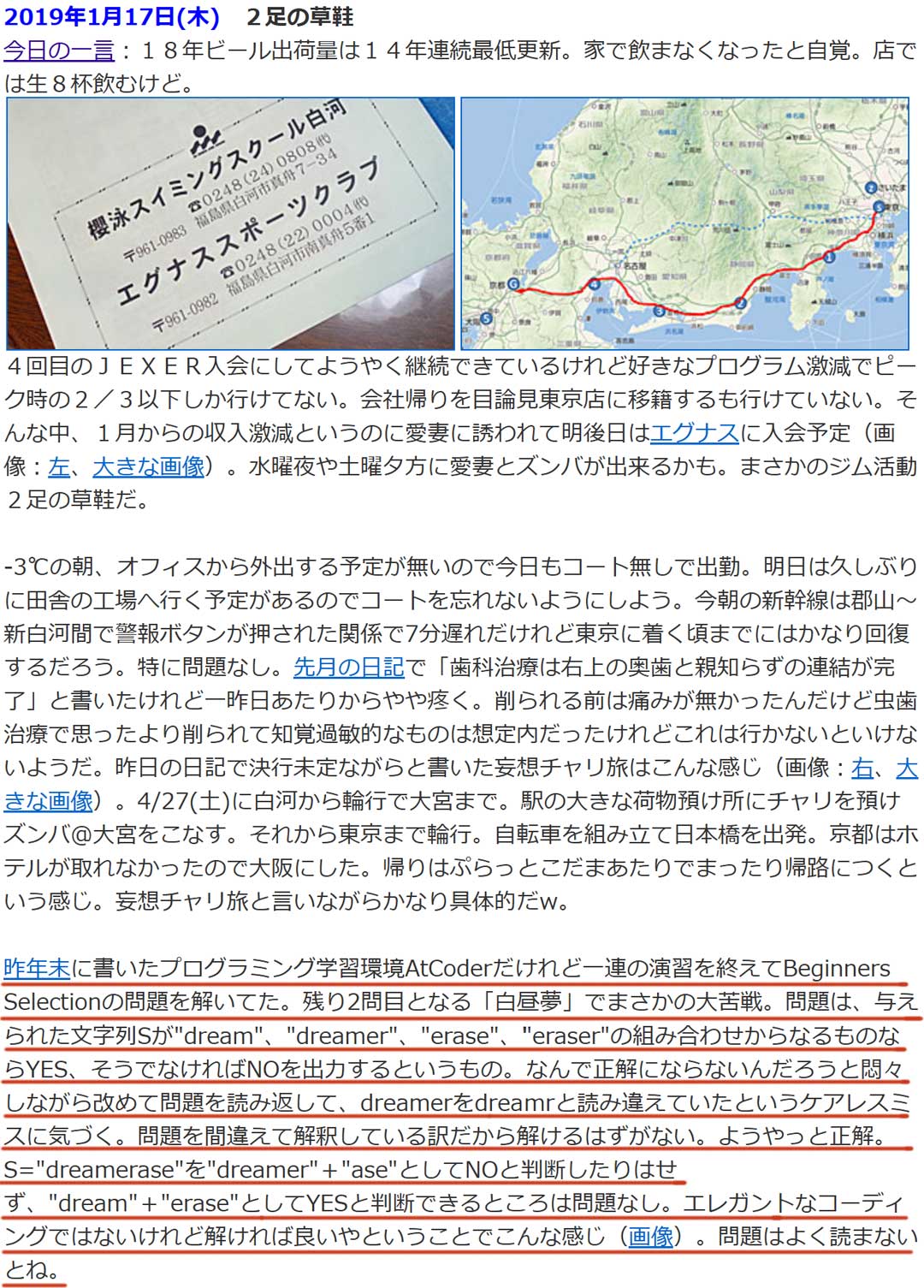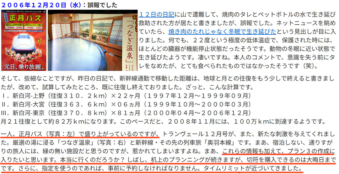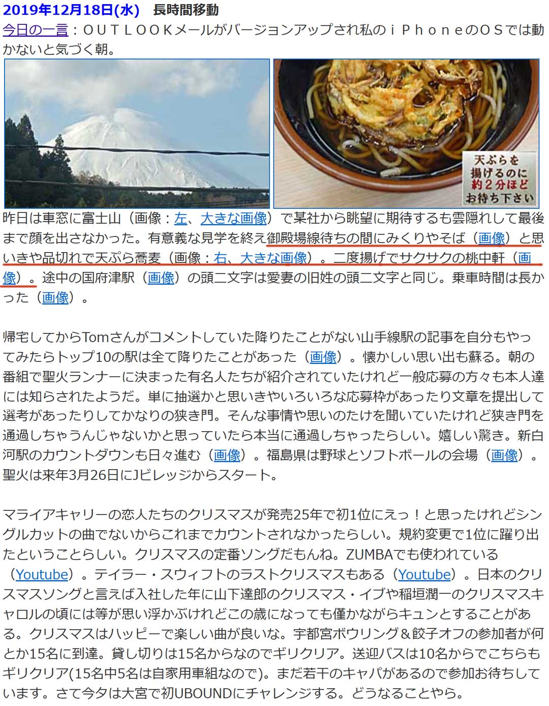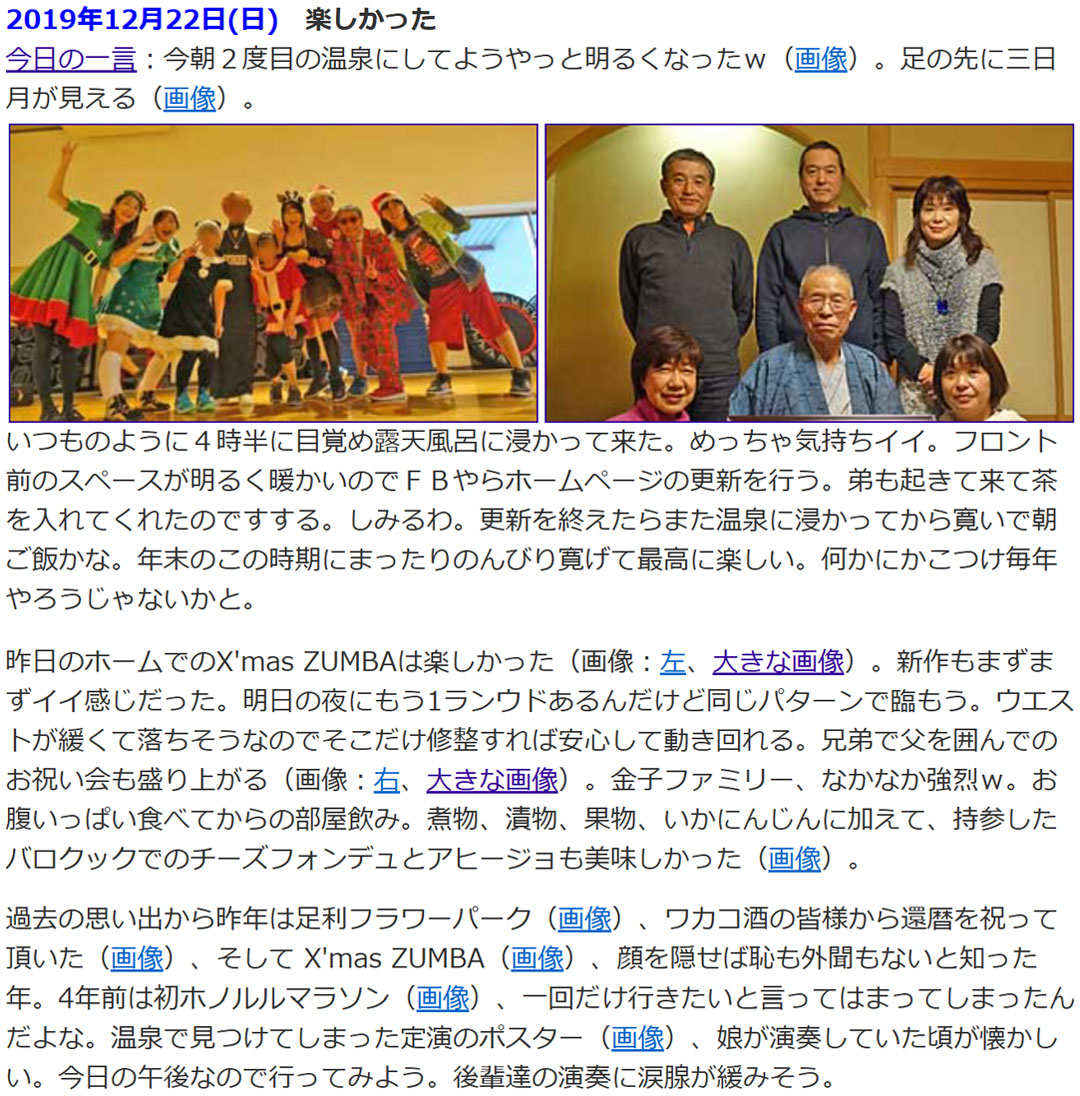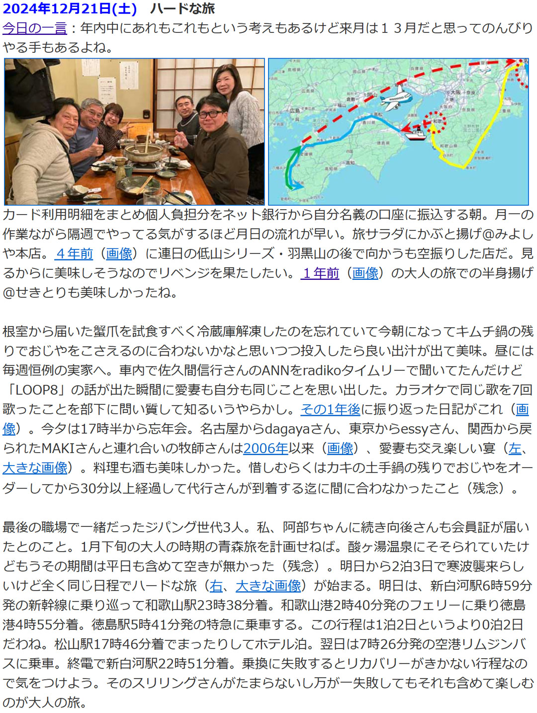 過去の思い出を振り返ると、19年前の今日(画像)、私は初めての「正月パス」を使った旅を決行できるか、胸を躍らせていました。年末年始は実家で過ごすという暗黙のルールを破る、初めての試みだったからです。この時のことは、ココログに詳しく残しています(決行前:その1、その2、決行後:その3)。1年前の今日(右、大きい画像)は、楽しい宴を楽しみつつ、翌日からは2泊3日の強行軍の旅(画像)でした。今年は、今のところ飲み会の予定は立てていません。年末年始は、子どもたちの家族や父を迎える準備をしながら、のんびり過ごせそうです。しかし、年明けは慌ただしくなります。1/5(月)~7日(水):ノープランの九州遠征、8日(木):仕事始め、10日(土)・11日(日):恒例の「ママチャリGP」。