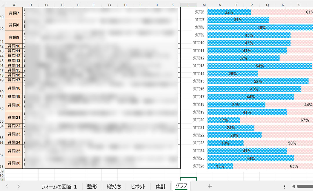 冷え込んでー4℃の朝(画像)。今日は中学校。次週火曜が今年最後の支援日。当日午後にアンケート回答を締め切るので、保護者、生徒、教師分のグラフ化を行うExcel3本を準備(左、大きな画像)。当日は、フォームの回答1に生データを貼り付けて、順次データ更新を行う。整形、縦持ち、ピボット、集計の各シートを経てグラフ化シートに結果がまとまる仕組み。