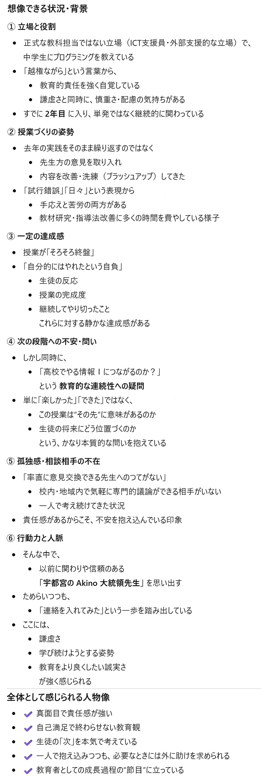 越権ながら中学生にプログラミングを教えて2年目。先生の意見も聞きながら試行錯誤を繰り返し昨年の内容をブラッシュアップする日々。そろそろ終盤で自分的にはやれたという自負はあるけど、高校でやる情報Ⅰに繋がるのだろうかという疑問が湧いた。率直に意見交換できるような先生へのつてがない。ふと、宇都宮のAkino大統領先生を思い出し連絡を入れてみた。