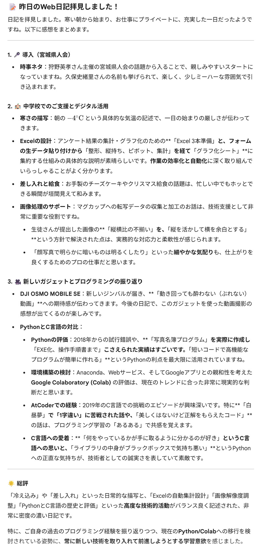 前段の内容から何が想像できるかGeminiに聞いた(画像)。chatGPTにも聞いた(画像)。昨日の日記もGeminiに聞いた(左、全文)。優しいよね。自己肯定感が低く自信が持てない時はAIに持ち上げてもらうのはありかも。先述のAkino大統領はソフトボール経験者で白河在住の頃にソフトボールに混ぜて欲しいとコンタクトがあった。いつのことかと探したら、新年会@芦野温泉に参加された時のココログに姿を発見(右、大きな画像)。2008年のことだった。情報の先生へのつては無かったけど、一本松で飲むときはお誘いしたい。amiっちさんも読まれていたらご一緒したいです。