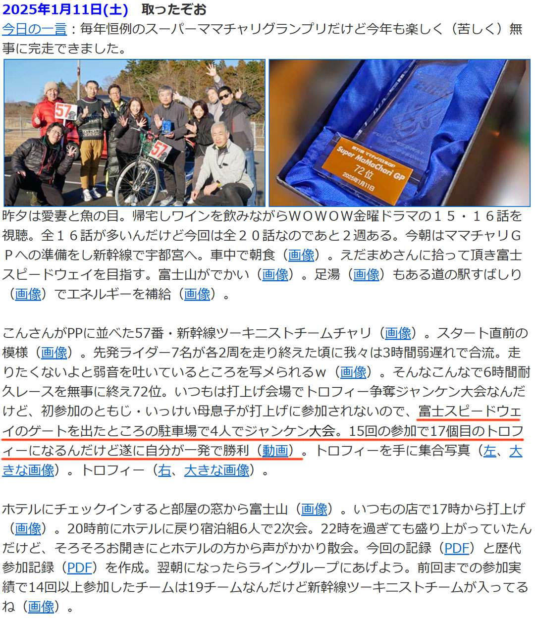 全国高校駅伝でが学法石川男子が大会新で初優勝(画像)に拍手。今日は冬至。今日を含めて今年は残り10日。今週の朝ぼらけのテーマ(画像)は、「今年の日記~あなたの今年に一言~」なんだとか。日記がテーマなら、久しぶりに投稿しようかなと思う朝。第一候補は、ママチャリGPのトロフィーゲットかな(左、大きい画像)。一発で決めた争奪ジャンケン(動画)。