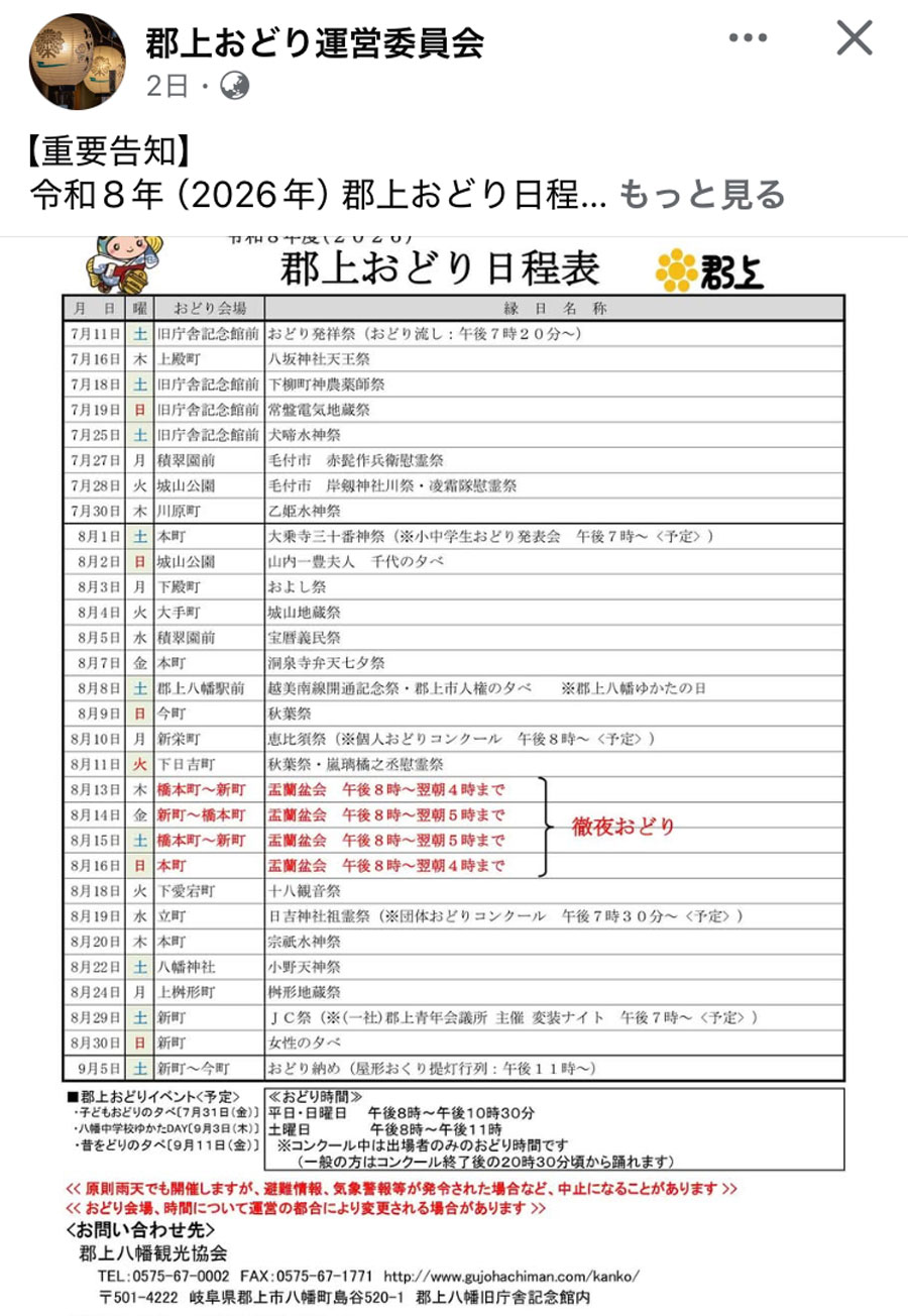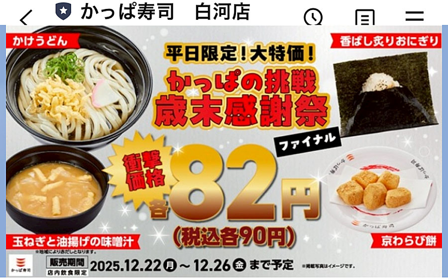 あまり縁が無いかっぱ寿司だけど、かけうどん&香ばし炙りおにぎりを、180円で食べに行ってみたい気がする(画像)。 令和8年の郡上踊りの日程が発表された(画像)。過去の思い出から、6年前(右、大きい画像)は、ズン友さん達とのX'masズンバ、兄弟で父を囲んでのお祝い会、どちらも大いに盛り上がって、改めて思い返すに良い時代だわね。