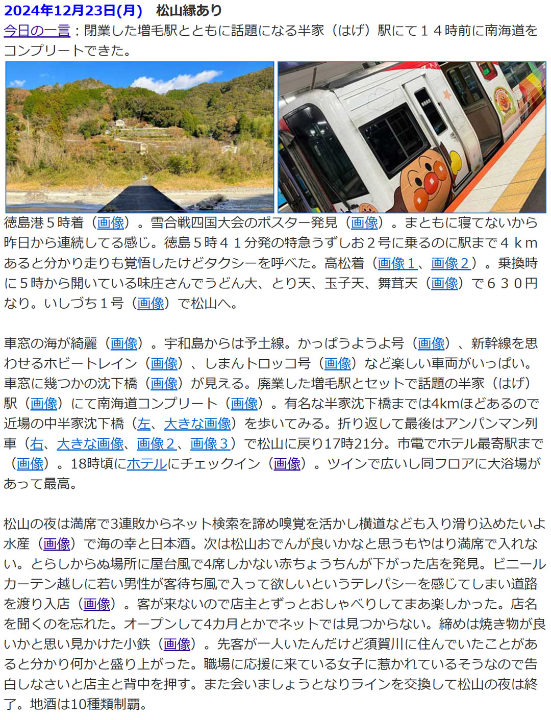 過去の思い出から。1年前(右、大きい画像)は、松山ナイトを満喫していた。3店連続満席で挫けそうになるも、自慢の嗅覚を活かし見つけた3店をハシゴ旅。加齢でリアルな鼻は鈍りつつあるが、良店を嗅ぎ分ける「酒場の嗅覚」は、経験も手伝ってむしろ鮮明になっていると自負している。 楽しかったなあ。持つべきものは(こっちの)嗅覚だな。前日は、福島の白河から鉄路で紀伊半島をぐるりと巡って和歌山入り。電車のない深夜帯をレンタサイクルで走り最後の国盗りをして(画像)、返却したのが23時45分。そこから和歌山港2時40分発フェリーで徳島へ渡り、高知の半家(はげ)駅で折り返して、ようやっと落ち着けた松山ナイトだった。