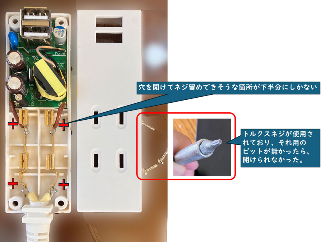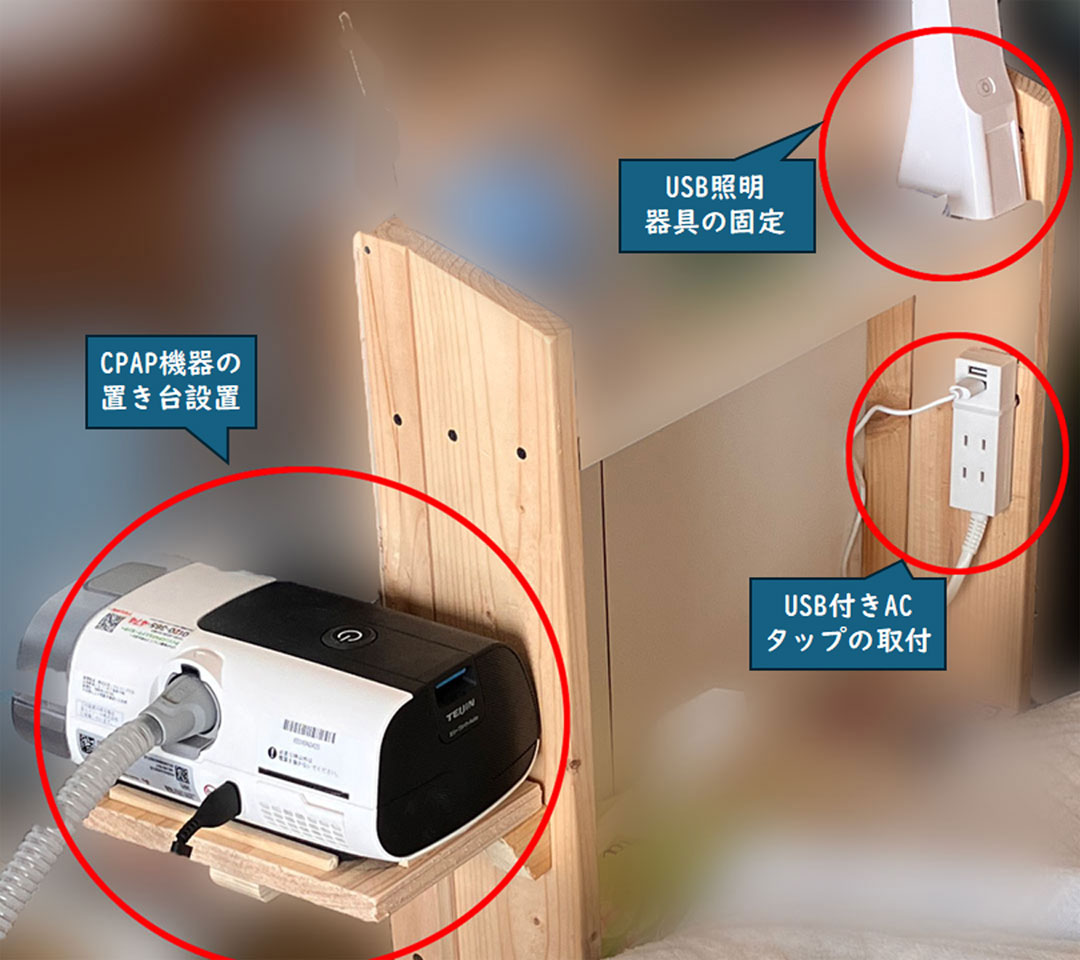昨日は、ベッド回りの環境整備を終えた。第1弾は先日の段差解消。折り畳み式シングルベッドに自作の拡張台を連結し、セミダブルマットレス+トゥルースリーパーという構造。荷重で折り畳みベッドが沈み、拡張台との僅かな段差が気になっていた。自作の脚台を製作し、薄板のスペーサーと組み合わせることで解決した。拡張台には自作の棚を嵌合しているけど、ACコンセントやLED照明が固定できないこと、CPAPの水タンクやホースの着脱がやりにくいことが課題だった。第2弾は、これらの解決である。CPAPは、棚の手前側の側面に専用置台を製作して設置。LED照明は底面を強力両面テープで固定し、側板に穴を開けてUSBケーブルを挿せるようにした。ACコンセントは、筐体を固定するネジが背面にあり、しかも特殊なトルクスネジ(星形)が使われていた。内部基板との兼ね合いで、棚の側板へネジ止めできるスペースは下半分にしか確保できない(画像)。そこで、棚側板にトルクスネジを締めるための穴を開け、ACコンセントを固定後に筐体をネジ止めした。上半分の固定にはインシュロックを使用(画像)。こんな感じに整備できた(左、大きい画像)。