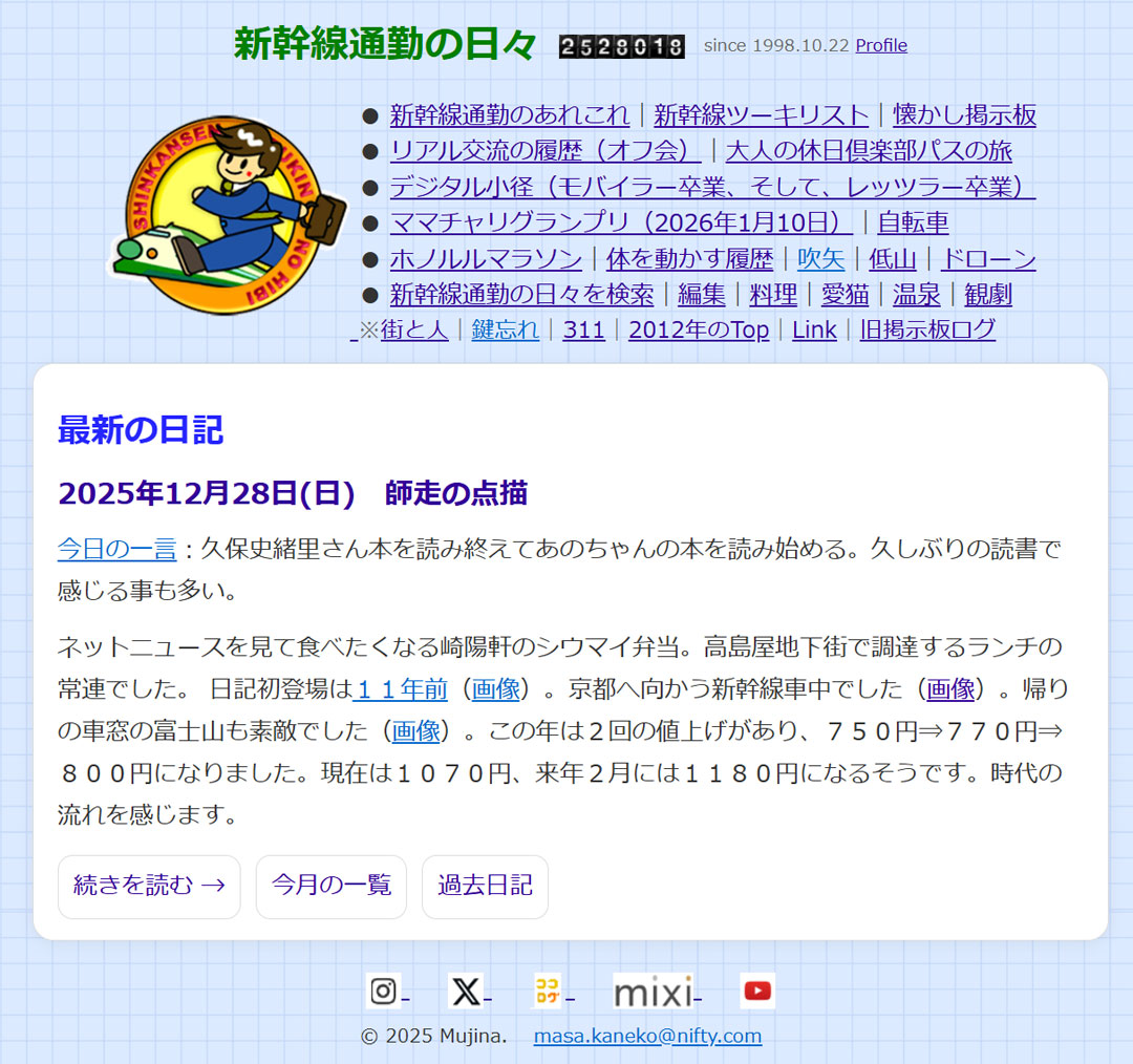 過去の思い出から、3年前(画像)は、函館で550円の五目丼(画像)のパフォーマンスに驚いた。まだあるかな。前日は、小樽ビールで当日の銘柄全制覇(画像)。ようやるわ。6年前(右、大きな画像)は、新幹線通勤22周年から数日経ち新幹線定期での移動距離を試算してた(画像)。その後、コロナ禍でペースダウンの後、定期廃止の都度清算となり、地球と月の往復3回達成に僅かに足りなかったと思う。当時、新幹線通勤も残り2年、その後のホームページタイトルをどうする?と聞かれ、まずはその時まで続けているかなと書いた。そのまんまのタイトルで続けているし、独自ドメインまで取得w。