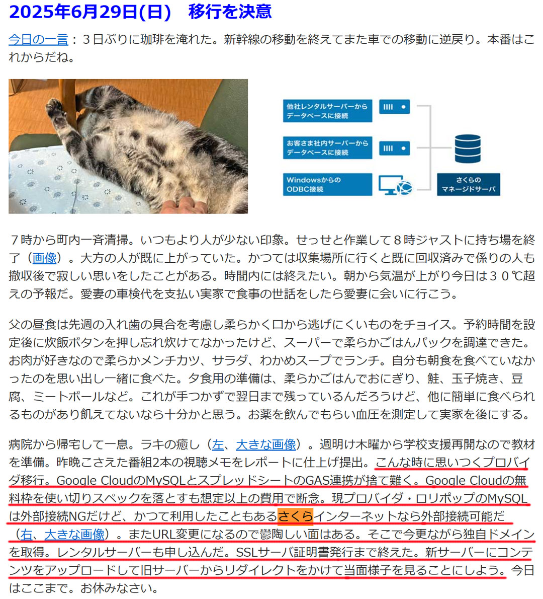 今日は、必要な食材をリスト化して、在庫を確認し調達が必要な食材をリストアップ。今夕は野菜炒め(右、大きい画像)と餃子を焼く。明日は実家へ行くので、帰りに買物をするつもり。明後日は大晦日。朝から調理開始、昼に父のお迎え、戻って調理を再開。夕刻には、娘夫婦が帰省し、第1ラウンド。元日昼には、息子一家が帰省し第2ラウンド。父、娘夫婦、息子一家が、それぞれ2泊ずつするし、孫が2人になり、大賑わいになること間違いなし。最新日記の第一段落までを自動で表示できるようになったのでトップページから日記へのカレンダーを削除した(画像)。半年前(画像)に、ロリポップからさくらインターネットへ移行して独自ドメインも取得したので、契約が残るロリポップを解約した(画像)。GASからMySQLに外部接続できるからが移行理由だったけれど、勘違いだった。現在、レシピや掲示板ではPHP経由でMySQLを利用している。PHP経由なら外部接続ができるね。