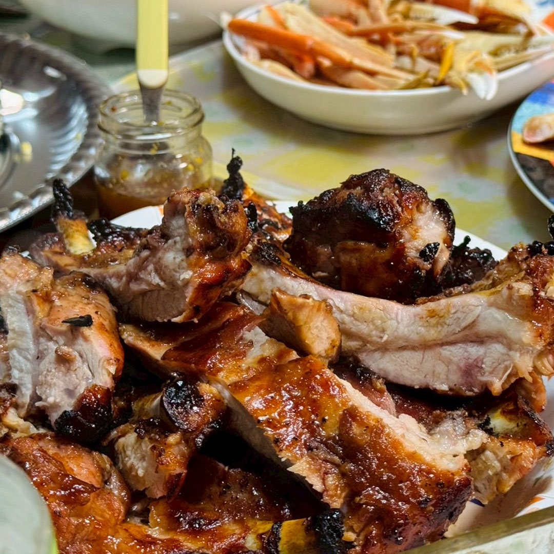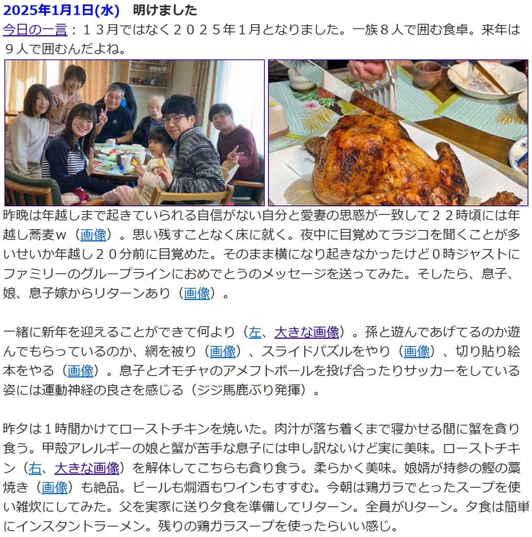 夜のメインは、ベビーバックリブ(画像)と蟹(画像)。父、娘、息子は蟹を食べないので、婿と嫁を中心にむさぼり食べた(笑)。ベビーバックリブは、半日かけて解凍し、すりおろしリンゴをまぶして1時間置いた後、調合したタレに8時間以上漬け込んだ逸品だ。その甲斐あって、柔らかく香ばしく仕上がった。さて、1年前(画像)は、「一族8人で囲む大晦日の写真」をあげて、来年は9人で囲むんだよね、と書いていた。例年、大晦日だけお泊まりする父を引き留めて2泊してもらったおかげで、念願の元日の食卓を9人で囲むことができた(右、大きい画像)。父は日中の運動効果もあってか、良い塩梅にテンションが上がり、かつての父のようだった。良き良き。刺激は大事だね。2026年は上々のスタートだね。