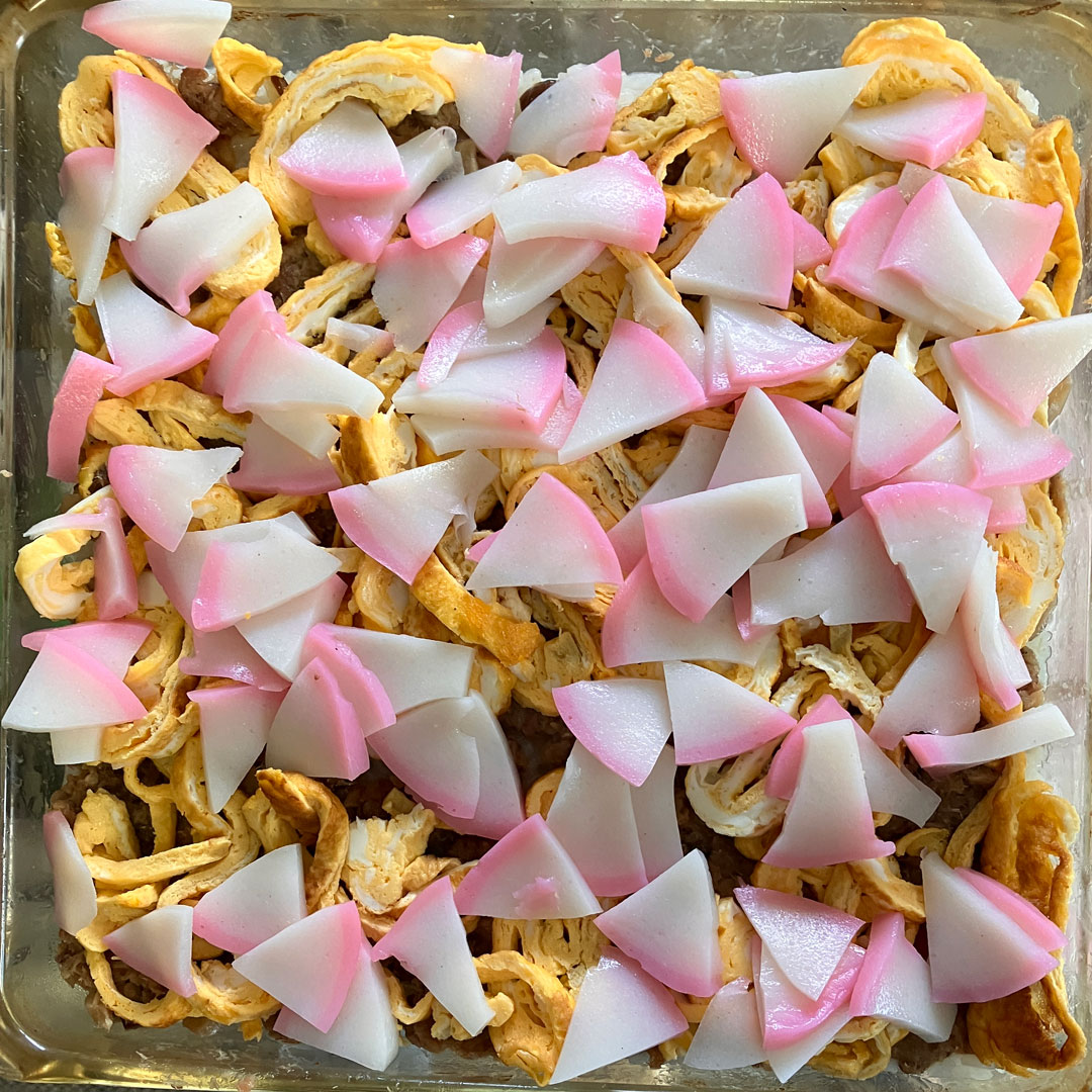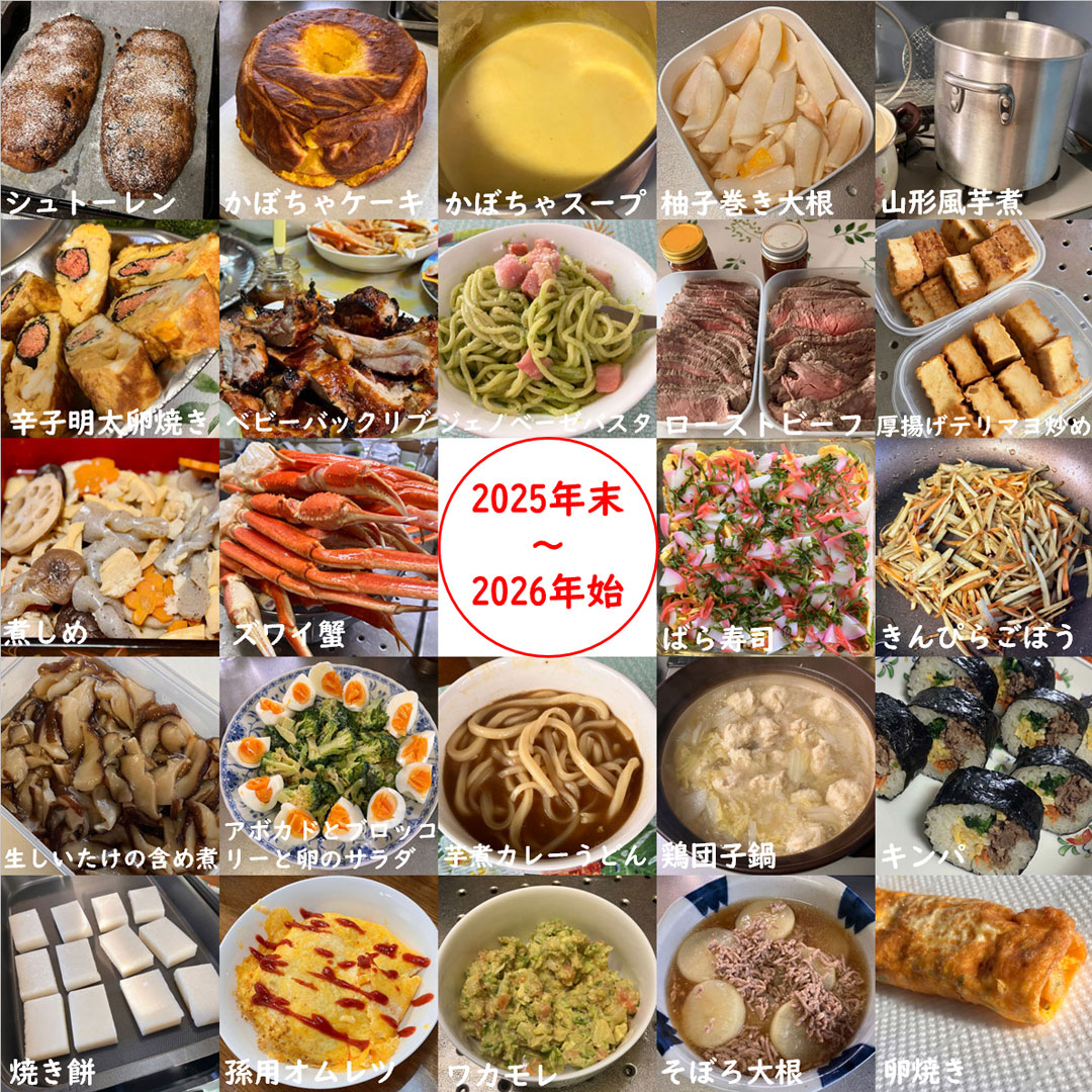 年末年始のメニューをリストアップ。①シュトーレン②芋煮③柚子巻き大根④ローストビーフ⑤生しいたけの含め煮⑥煮しめ⑦厚揚げテリマヨ炒め⑧きんぴらごぼう⑨辛明太卵焼き⑩キンパ⑪かぼちゃのケーキ⑫かぼちゃのスープ⑬ジェノベーゼパスタ⑭ベビーバックリブ⑮バラ寿司⑯蟹⑯アボカドとブロッコリーと卵のサラダ⑰芋煮カレーうどん⑱ピザ⑲鶏団子鍋⑳牛ハラミ野菜炒め㉑ミスジステーキ㉒オムライス㉓ワカモレ。過去の思い出から、6年前(画像)は、前夜の実家でも新年会の写真をあげていた。これが、一族で実家に集う最後の新年会だったね。