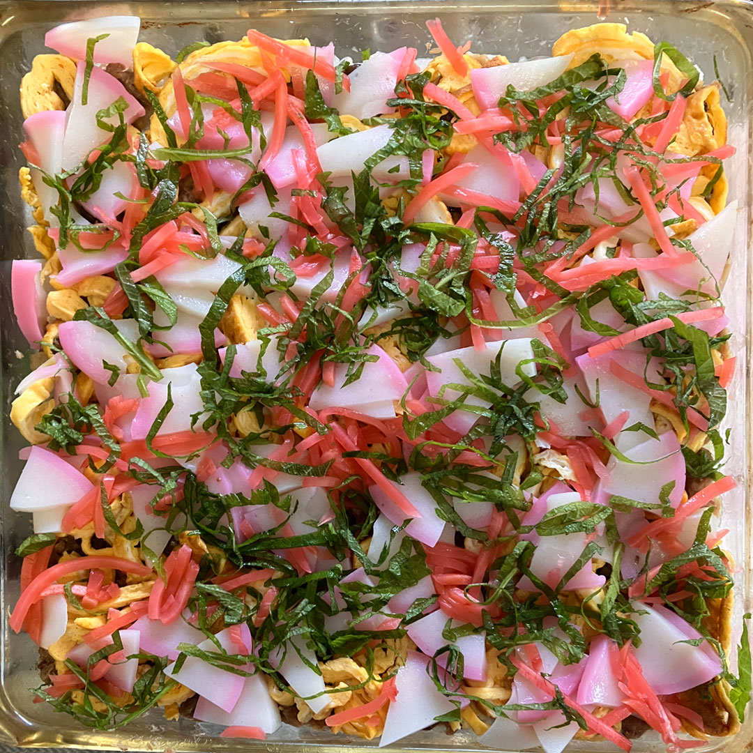 昼前に愛媛からバジル(100g×2袋)が届く。早速、葉60g(画像)を使って約200ccのジェノベーゼソースを作った。7人分の製麺に追われている間に、妻の迎えで帰省した息子一家4人が到着。大人のランチはジェノベーゼパスタ(画像)だ。バケットで拭って食べる残ったソースがまた旨い。続いて、ばら寿司をこさえる。酢飯に、手作りの椎茸甘露煮(画像)とサバ缶そぼろ(画像)をのせるを繰り返し二層にする(画像)。仕上げに錦糸卵(画像)、かまぼこ(画像)、紅ショウガ(画像)、大葉(画像)を散らして完成。食後は孫に誘われて寒空の下でボール遊び。驚いたのは、普段なら「俺はいい」と参加しない91歳の父が加わったこと(左、大きい画像)。久々に運動する姿を見た。(ひ)孫効果は絶大だね。
