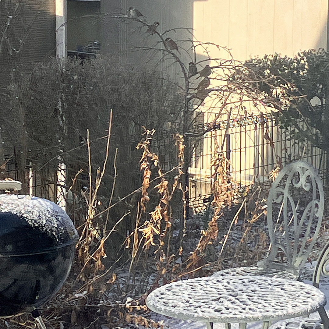 目覚めてアップルウォッチを見たらちょうど3のゾロ目だったので、慌てて、デジタルクラウンとサイドボタンを同時に押してスクショ(画像)。白河に行ったら雪が見られるかなと言っていたらしい孫の願いが叶い雪が舞う朝。庭に目をやると小枝に7匹の雀(画像)。うっすらと積もった雪の中で嬉しそうな孫(左、大きい画像、動画)。それから間もなく跡形もなく消えてしまった雪。