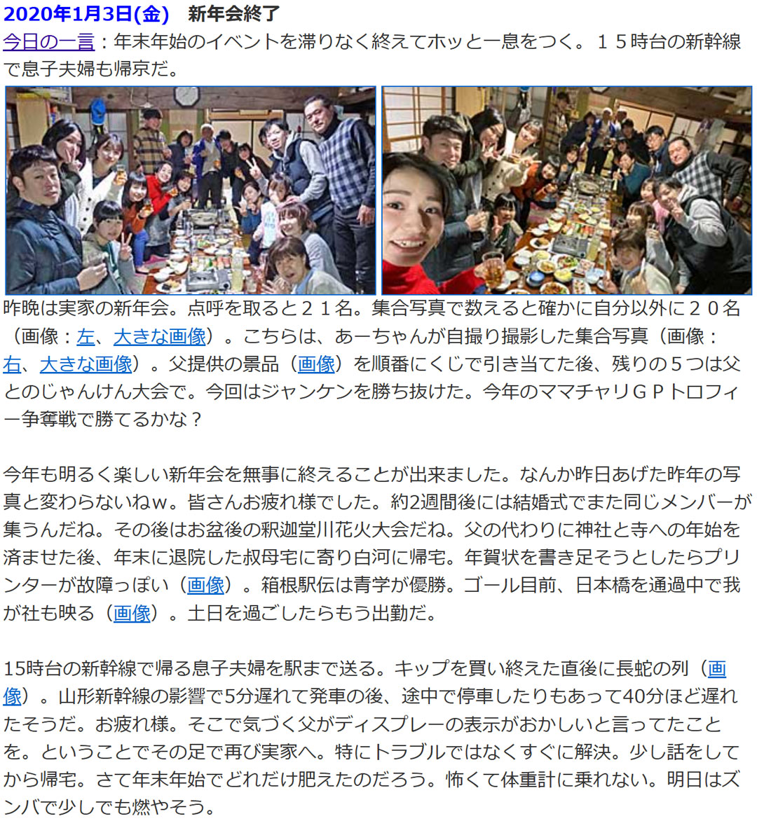 今日の一言:父、娘夫婦、息子夫婦、そして孫二人。9人の笑顔が揃う正月は、平和で何物にも代えがたいね。
