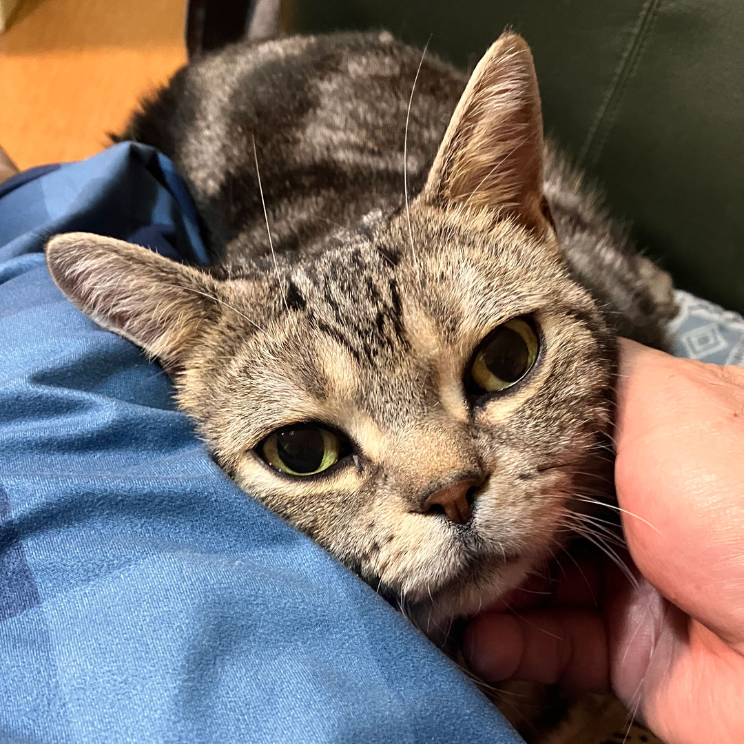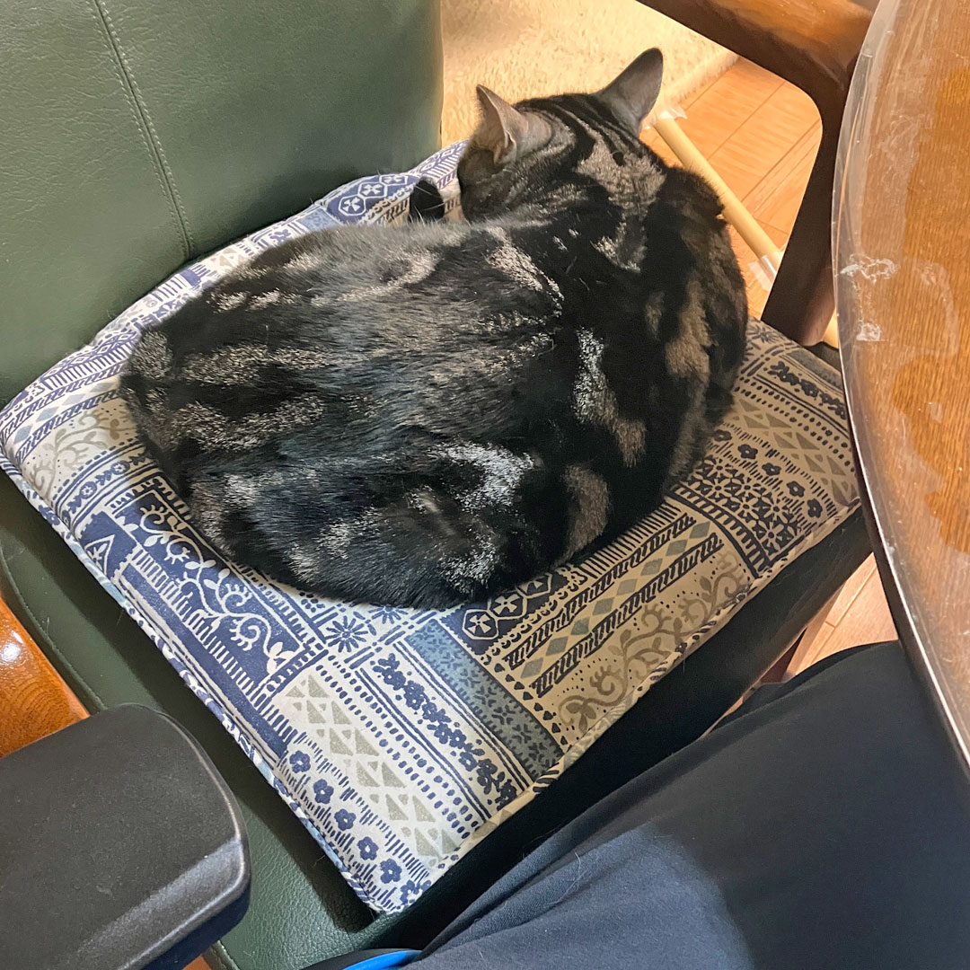 今日配信されたプロボノの9話を横になりながらスマホ片手持ちで1.5倍速視聴してから起きる朝。アップルウォッチのライトを点けずに暗い中で立ち上がったら平衡感覚が怪しくてふらつきそうになった。視力の助けも借りないとまっすぐ歩けない。朝ご飯を待っていた猫達。食べ終えて寛ぐ猫達。静かになって落ち着きを取り戻したラキ(画像)。賑やかな正月だったから無理もない。