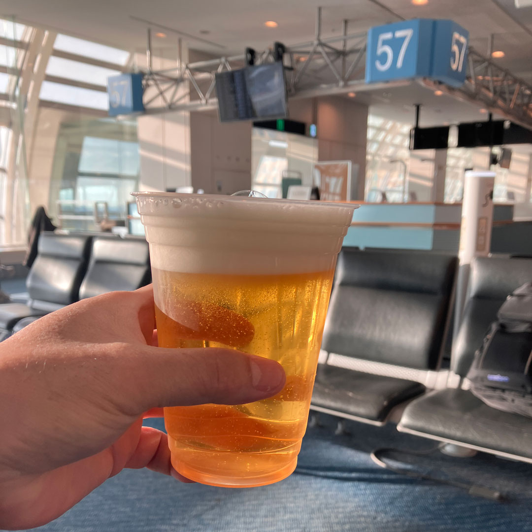 4時台で発売中止の自動券売機が何時から使えるのか巡回中の駅員さんも正確に把握していない。予想どおり5時から使えた。明日まではジパング割引が使えない期間。黒磯、那須塩原、東京、浜松町で乗り換え羽田空港第2ターミナルへ。保安検査を終えて8時15分にはプシュ(画像)。今回は一人でプシュだけど、4年前と21年前に、愛妻と出発前のプシュをしていたのが懐かしい。