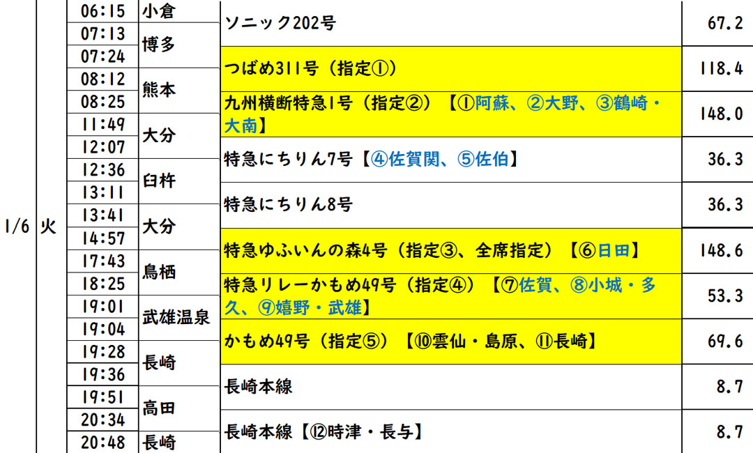 小倉を6時15分発。博多から熊本までつばめ311号(画像1、画像2)。熊本から大分までは九州横断特急1号(画像1、画像2)。臼杵(画像)で散策を試みるも北部九州エリア外で料金が発生すると言われ降りずに折り返す。大分のうまやの粋(画像)のりゅうきゅう茶漬けととり天定食(画像1、画像2)が美味しい。大分から鳥栖へは特急ゆふいんの森4号(左、大きい画像)。