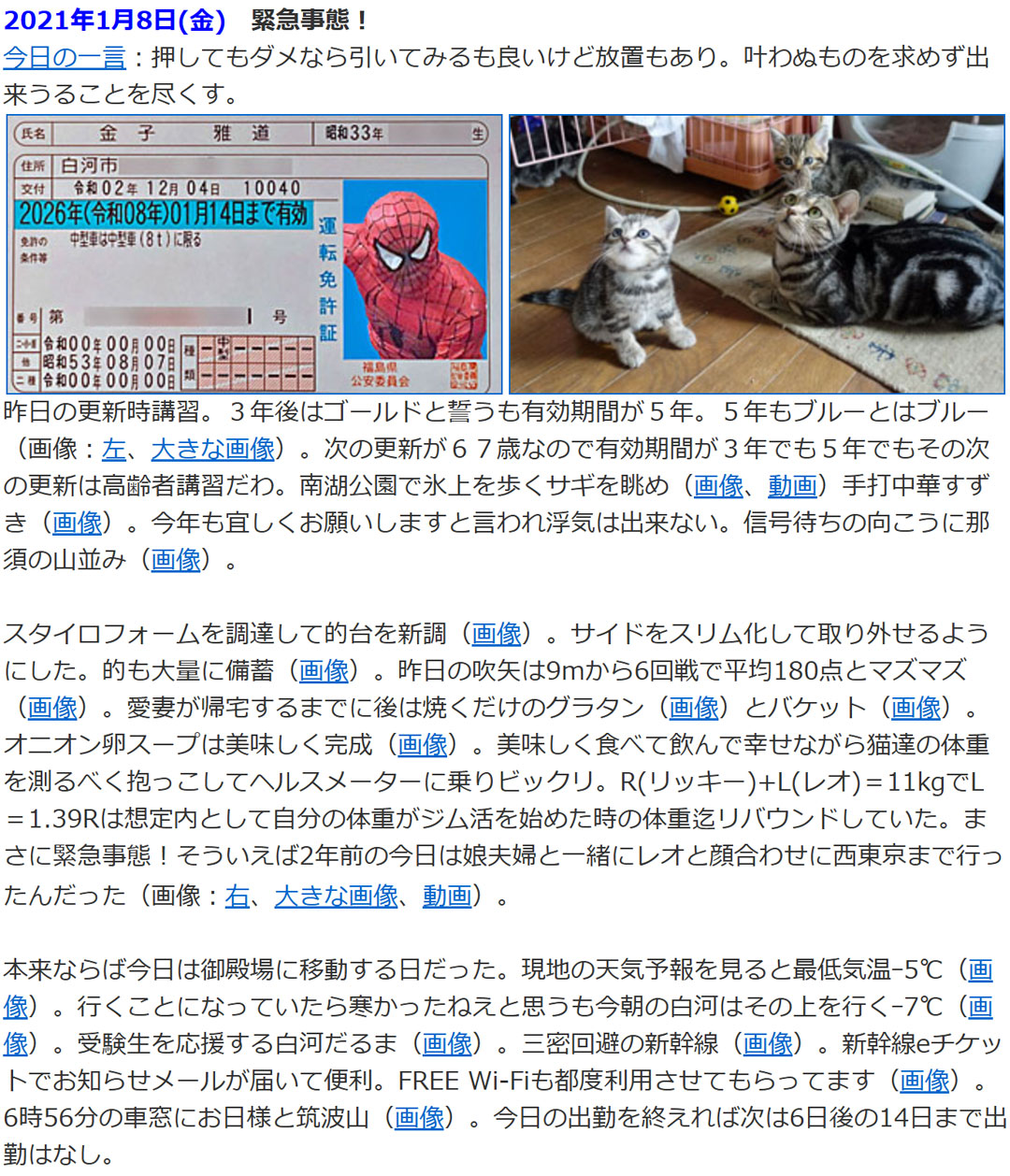 今日の一言:もう金曜、1月前半終了、今年の1/24終了。大人の旅の時期、白河の最低気温は-7℃予想。