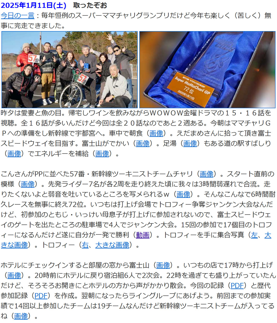 帰宅して休肝日もありかと思ったけど、従姉妹から旦那さんお気に入りの日本酒を頂き、飲み始めちゃった。純米にごり生酒(画像)は度数以上にきくね。1月の怒涛の前半が無事に終了。ちびちび飲みながら日記更新中。今日中にはアップできるはず。過去の思い出から、7年前(画像)は、還暦直後のママチャリグランプリでサプライズもあり最高に楽しかった。