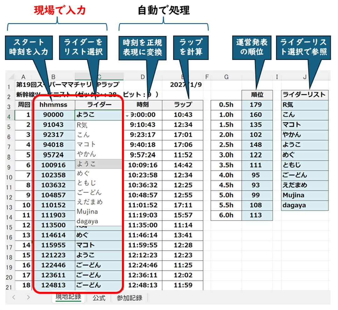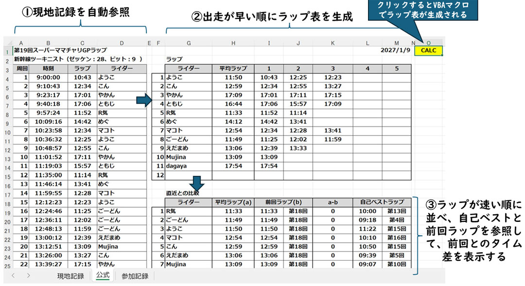 年末に提供した仕組みが順調に稼働しており特に急ぎの案件もなくのんびりととした一日。残り1時間でExcelの相談が舞い込んだのでちょうど良かった。年間計画表で月別の日数や時数の集計や年度に応じて年間カレンダーの曜日を自動更新するようにしたり。折角なのでうるう年判定を加え2月29日の有無が自動で処理されるようにした。本日も無事に終了。来年のママチャリに備えてラップ計算のExcelを改良した。スプレッドシート化して現場で誰でも入力できるようにしたのは今年運用済み(画像)。参加記録シートに直近ラップと自己ベストラップのデータを追加(画像)。皆さんに配布したり公開するリザルト(画像)は、VBAマクロも使いcalcと書いた黄色のセルをクリックするだけで自動処理されるようにした。