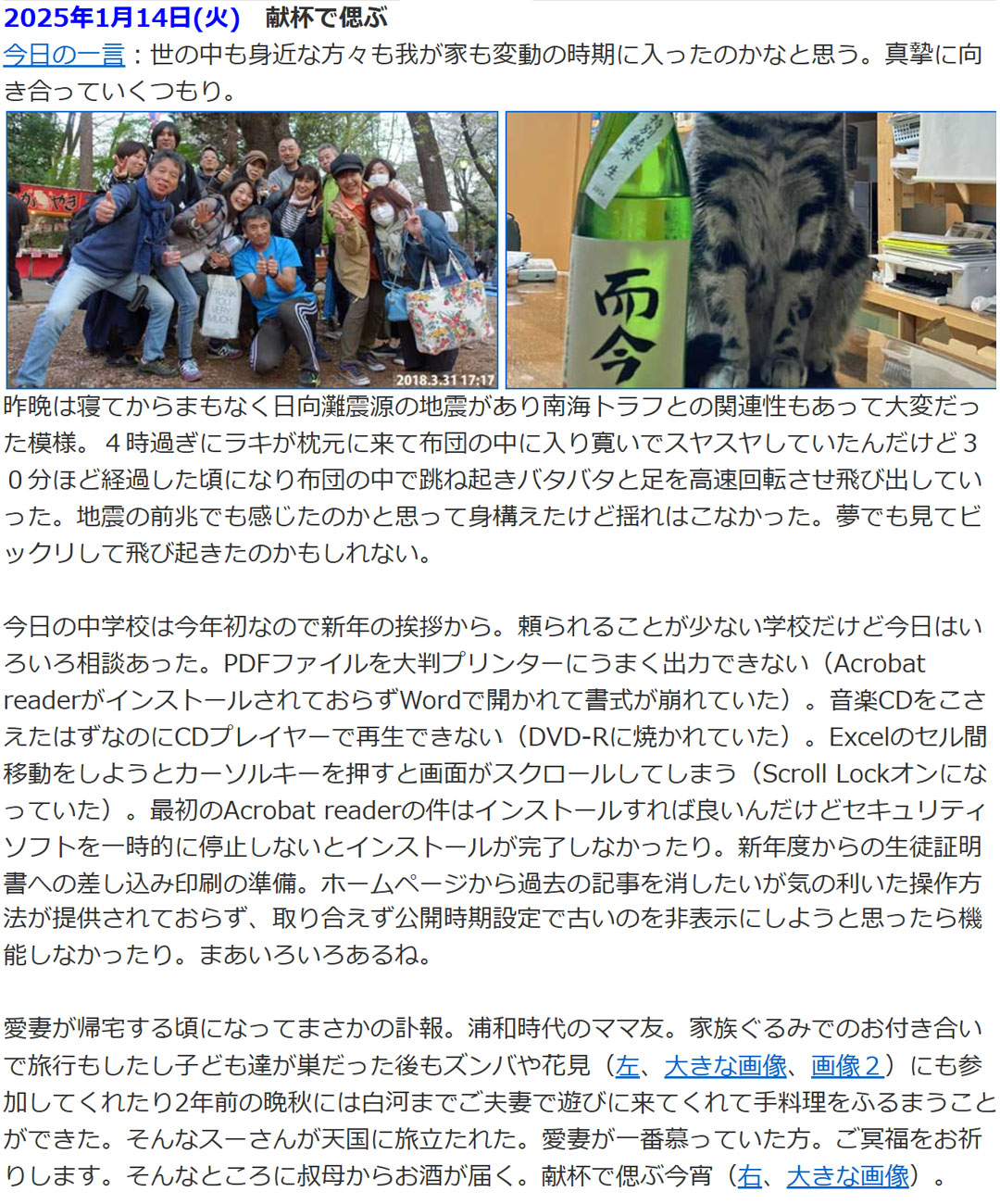 次回のあのちゃんのANN0で海のパジャマ2026とスリッパが発表される。また買うかもしれない。一年前(画像)は、スーさんの訃報を聞き献杯で偲んだ。あれから一年。今日は半世紀前位に一度会ったきりの村上さんの誕生日でもある。直近のことは忘れるけれど昔のことは鮮明に蘇ったり、食事でこぼしたり落としたり、体をひねれば攣りそうになったり、高齢者街道まっしぐら。