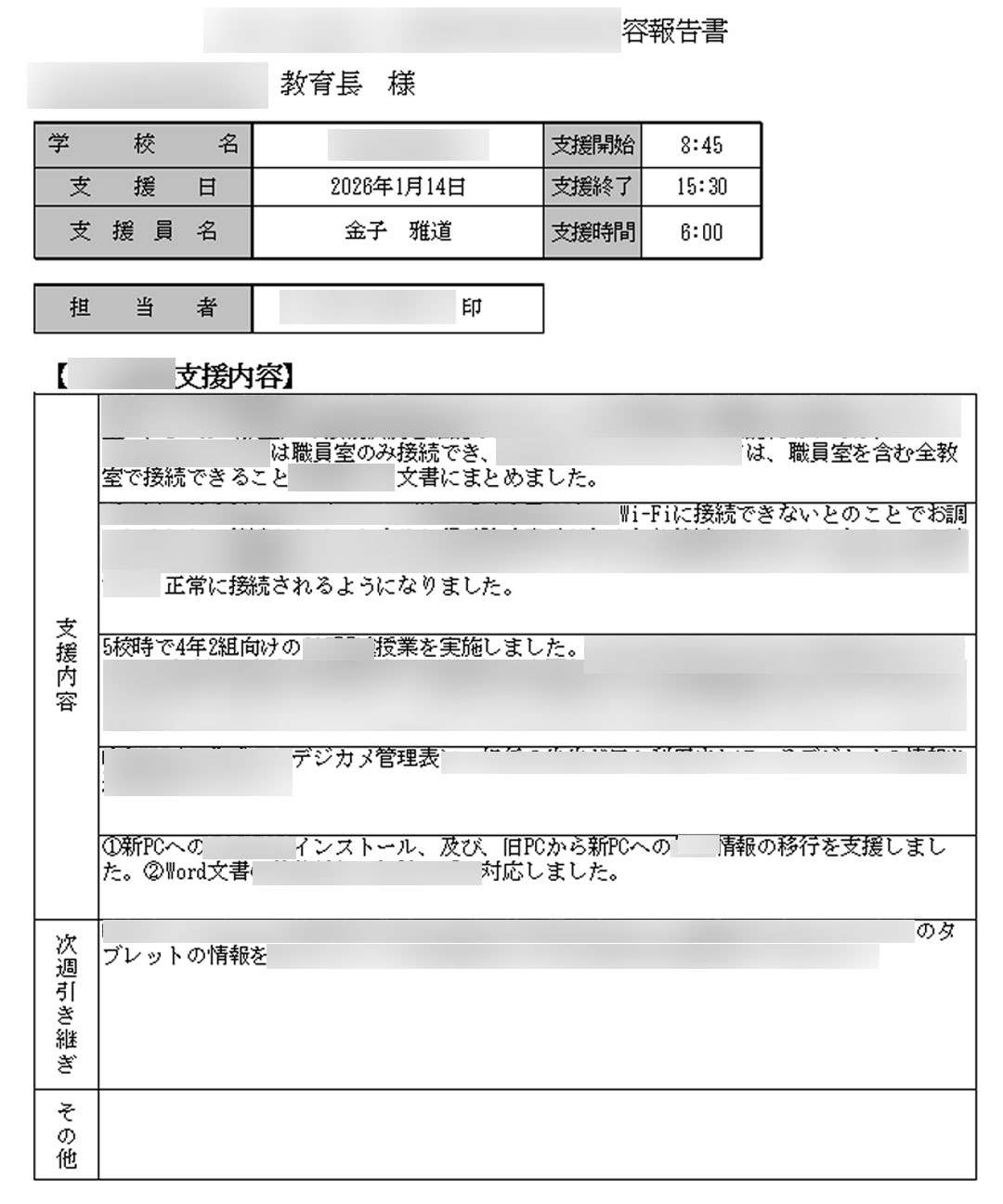 担当校への新年のご挨拶も今日の小学校で一巡。給食の味噌汁はネギ入りw(左、大きい画像)。今年初なので依頼事項が多く支援報告書が埋まる(画像)。帰りがけに次週の相談があるも、大人の旅で来ないので、ささっとまとめ対応を済ませた。今夕は、焼きそばをリクエストされていたのであり合わせの材料でこさえた。白菜とピーマンを胡麻油で炒め取り出し、豚ロースと海鮮ミックスをショウガ&ニンニクを加えて炒め取り出し、麺をしばし炒めてから付属ソース&魚粉で味付けしてから、野菜と肉&魚介を加えて追い焼き&蒸して完成。美味しく出来上がった。