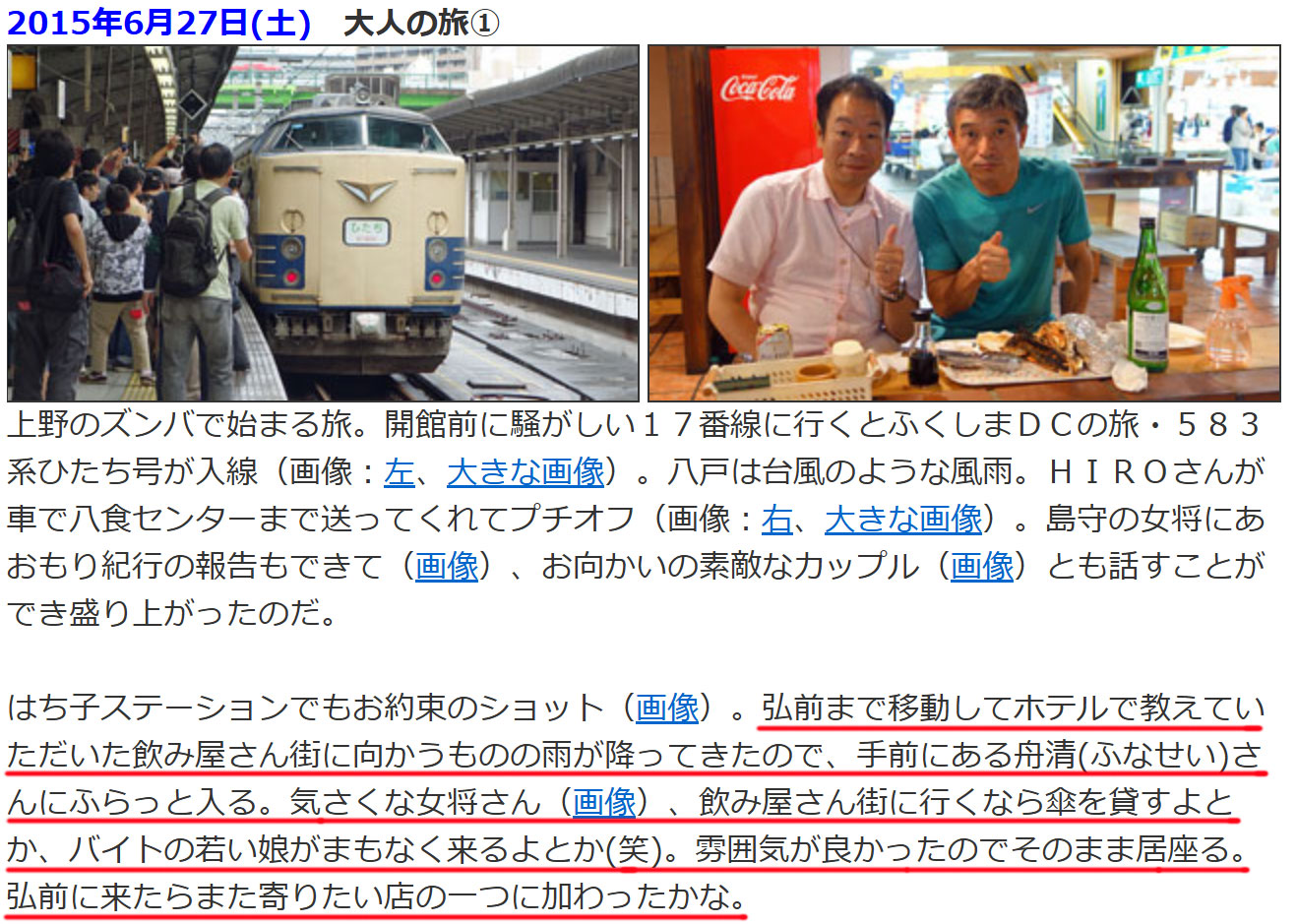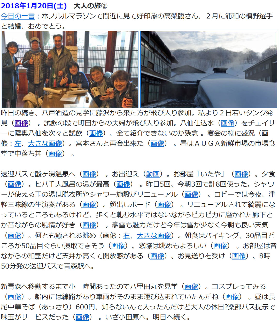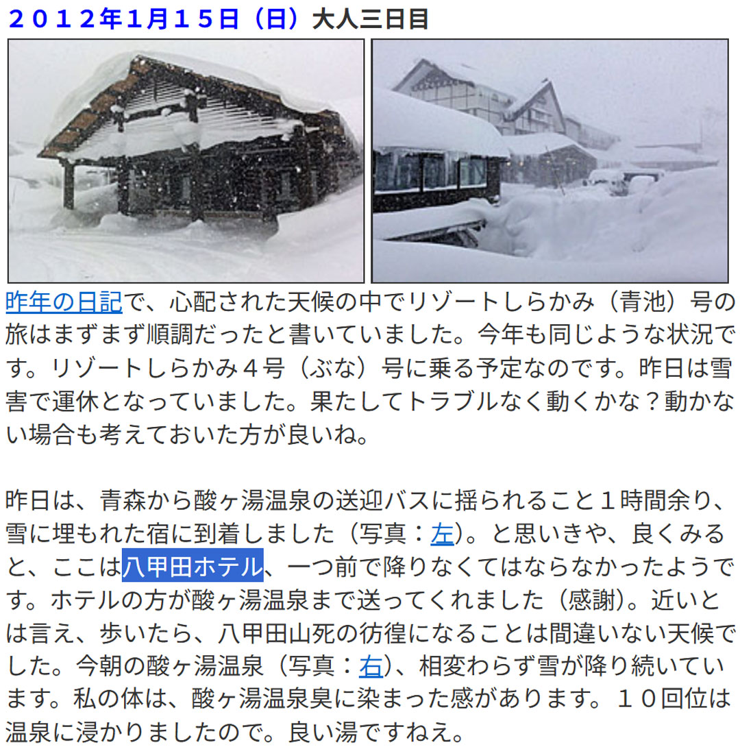 朝の番組で期間限定で空港に設置された衣類圧縮機を紹介していた。スーツケースに入りきらない衣類の容積が半分以下になり空きも出来て素晴らしい。万々歳とは言ってたけど、帰りの空港には装置が無いのでどうなるんだろう。一本松と舟清さんへ行く日を連絡。学校帰りに今年度の国保の残り2回分を振り込み、駅でネット予約済みの大人の休日倶楽部パスと指定席券の発券、愛妻分の宇都宮往復分の切符を購入。過去の思い出から、14年前(右、大きい画像)は、初の酸ヶ湯温泉。吹雪いていて酸ヶ湯温泉で折り損ねその先の八甲田ホテルまで行ってしまいホテルの方に送ってもらったんだった。酸ヶ湯温泉は大人の旅の際には必ず行けるかチェックしているんだけど大人の時期は無理っぽい。