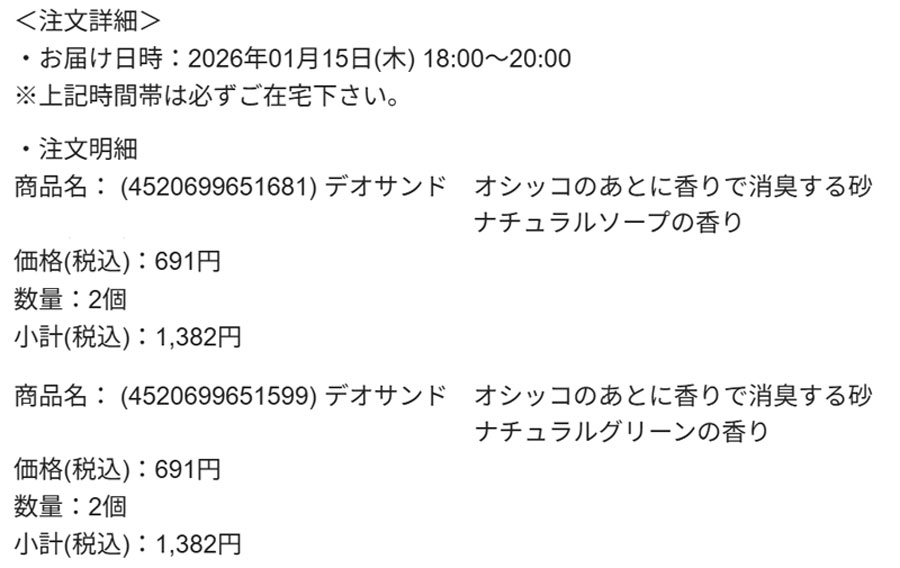 最後の猫砂の封を切ったのでそろそろ補充せねばと思う朝。幸いにベイシアネットスーパーが25日まで送料無料だというので注文。同一品は2点までなのだが香り違いがあったので2種で4点を発注(画像)。今夕18時以降の配達枠があったので指定。これは楽ちん。現在のところ、送料無料期間が度々あるので、重たい商品やリピート品は利用するに限るね。