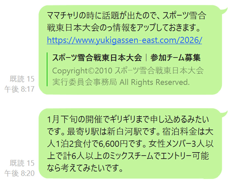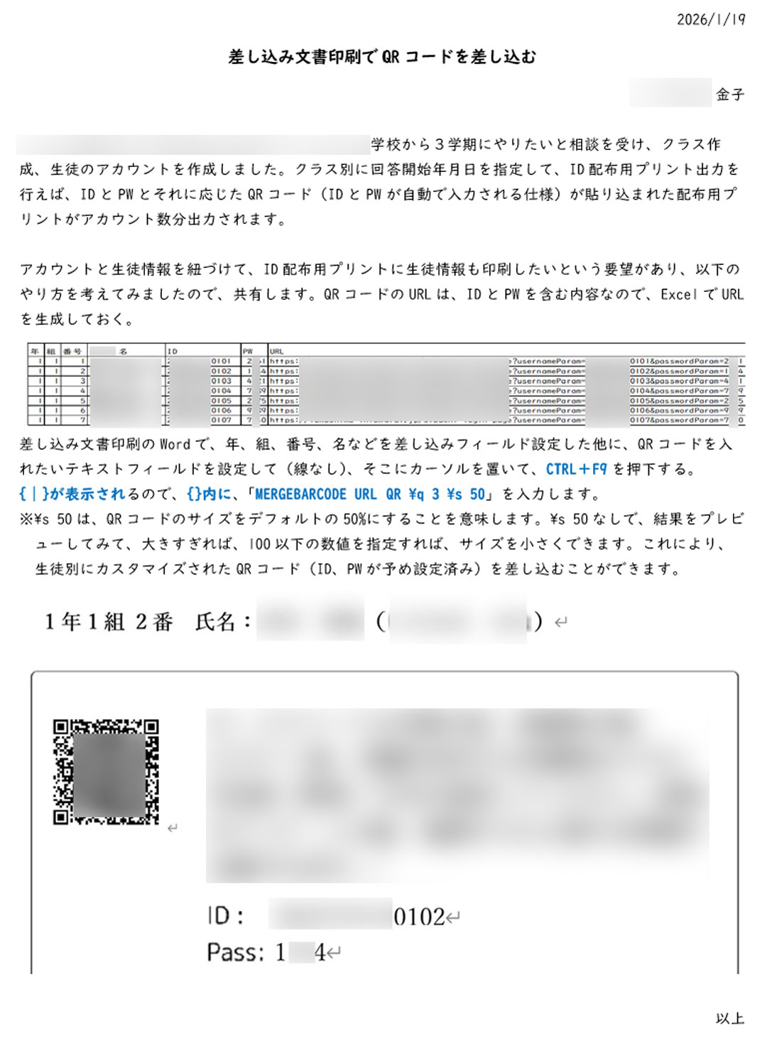実際の昨夕は、学校帰りに寄った書店で偶然にも千葉ちゃんに遭遇w。情報Ⅰの参考書(画像)と、晩酌用の緑川(画像)を調達した。帰宅後、緑川を嗜みながら、Wordの差し込み印刷でカスタマイズQRコードを入れる方法を試行。ExcelでURLを生成し、Word側でQRコードとして差し込むことに辿り着けた。 嬉しくて仲間に共有(画像)したが、少し浮かれすぎたかも。勢いで、ママチャリGPのライングループに、スポーツ雪合戦東日本大会(左、大きい画像)への参戦を提案(画像)。女性陣3人の感触も悪くない。実現したら、来年の1月はさらに熱くなるね。ミックスクラスは勝田マラソンと日程が被っているとか。来年も2週にわたっての開催なら勝田マラソンと被らない週のクラスへの参加を検討しよう。アクティブな皆様は、ママチャリ、雪合戦、勝田マラソンと3週連続になるんだね。