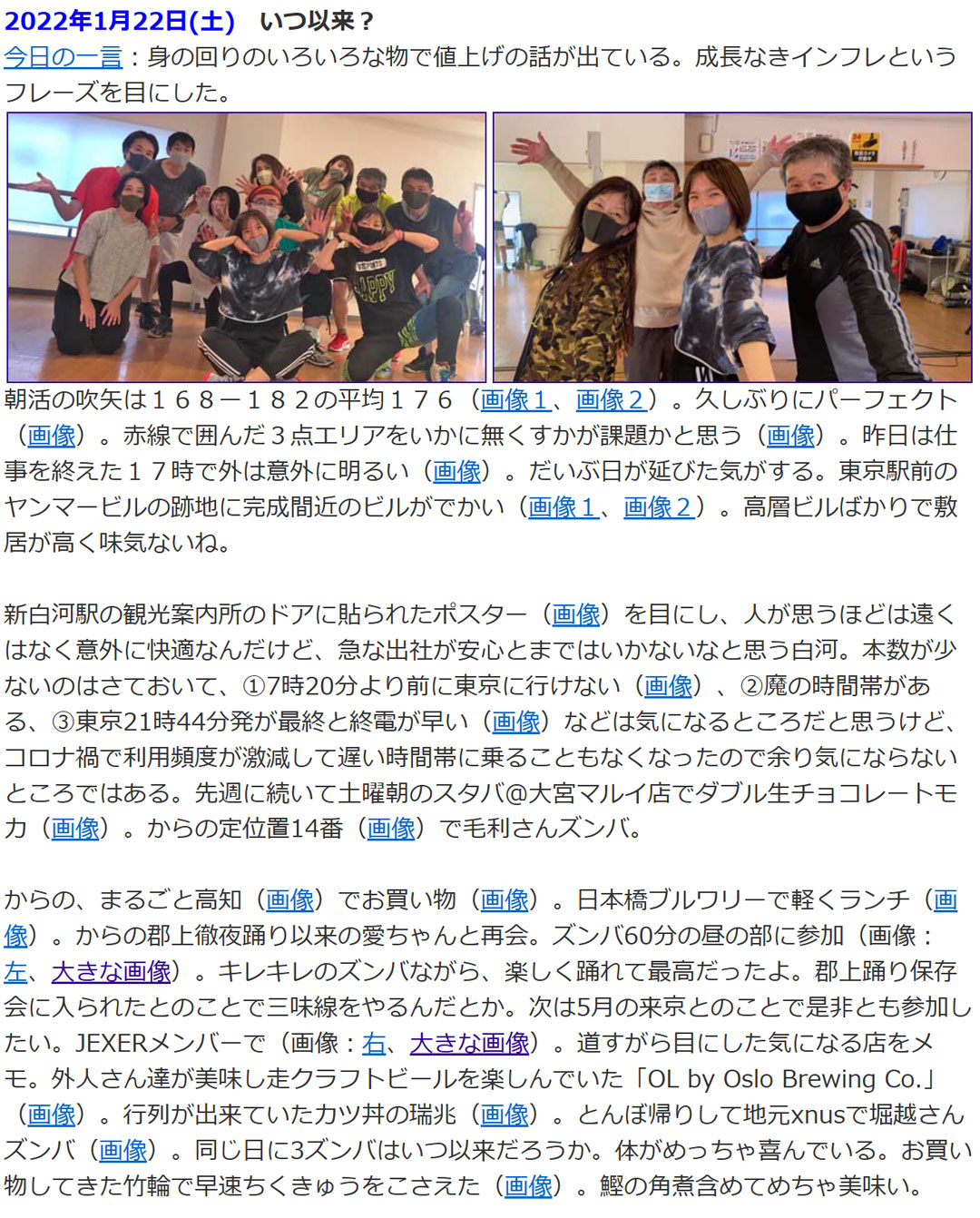 今宵の新年会は神田。15時半の0次会(餃子酒場)から始まり、本会は3時間半の日本酒飲み放題という長丁場。4人で22合も飲んだけれど、お代わり自由のしじみ汁(画像)が肝臓を守ってくれた。最後まで正体を失わずに楽しめた(右、大きい画像、画像2)のは、間違いなくあの濃厚なエキスの恩恵だ。過去の思い出から、1年前(画像)は、清津峡で雪崩で立ち往生する車に遭遇し、4年前(画像)は、郡上に帰られた愛ちゃん先生が来京されたので、Jexer四谷時代の仲間とともにズンバを満喫していた。