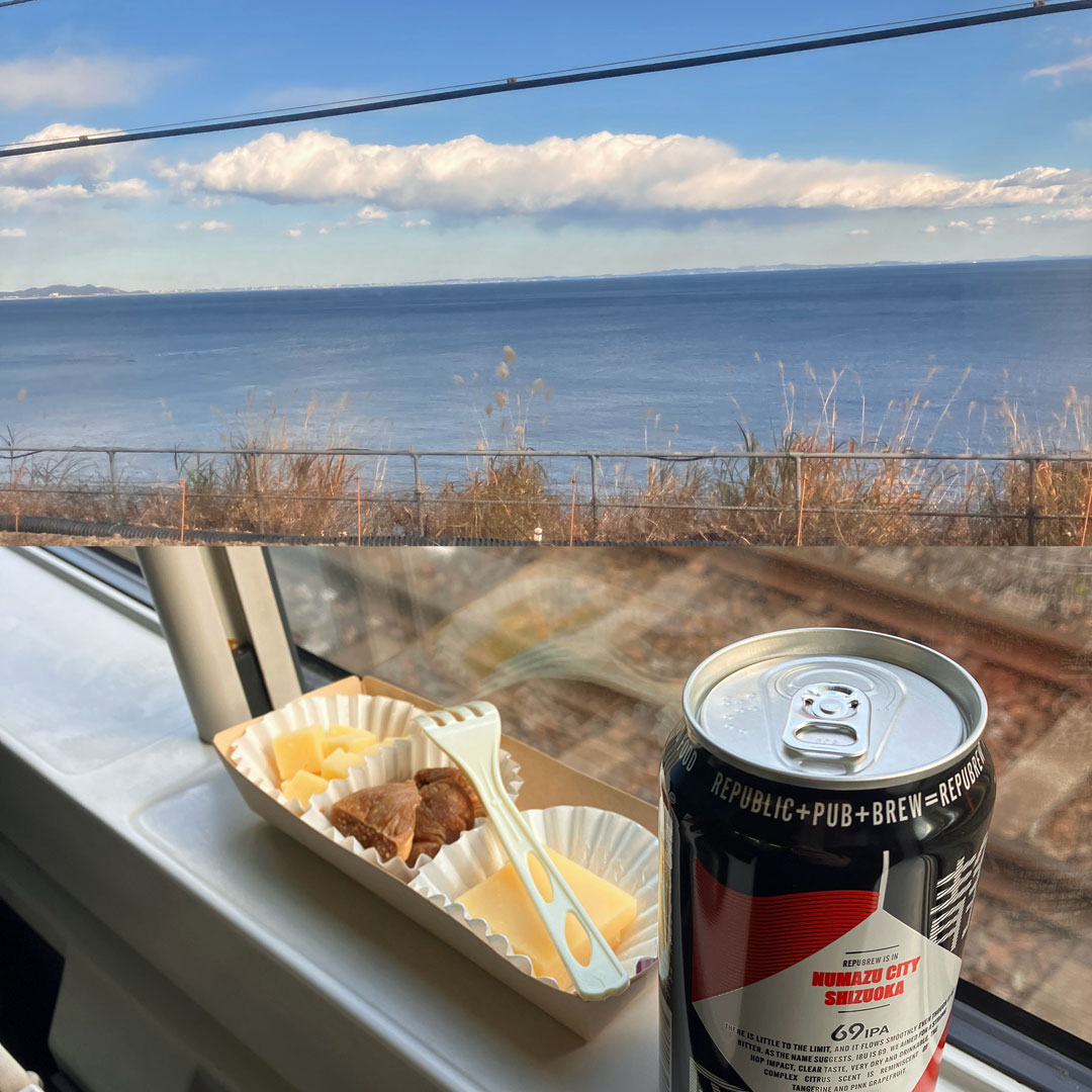 網代へ足を伸ばし、平鶴の海へと続くような露天風呂(左、大きい画像)で至福のひととき。熱海に戻ると、朝の静けさが嘘のような大賑わいだ。魚とやも満席で待ちが発生。駅ビル・ラスカ熱海の屋上にBBQテラス(画像)を発見し、食材持ち込みプランがあることをメモ。次はここもアリだ。 帰路の踊り子4号(画像では、成城石井の地ビールを片手に、記念館からの急ぎのHP修正依頼に対応。揺れる車内での作業も、車窓を流れる景色があれば楽しくもある。