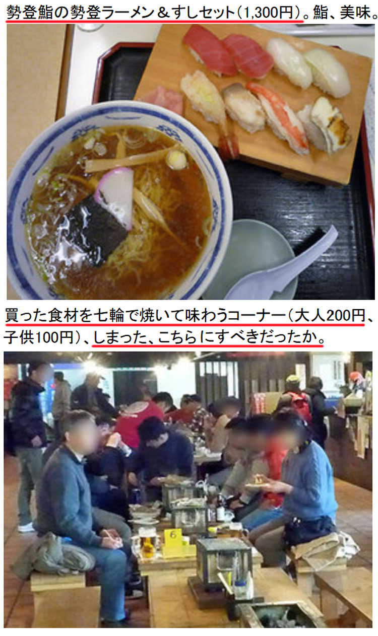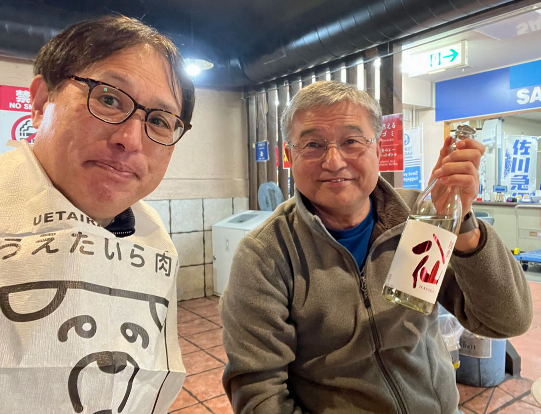 さらに冷え込み-7℃の朝。仙台朝市(画像)はましん食堂で、飛露喜(画像)と朝市丼(画像)で最高のスタート。その後、八戸へ。念願のえんぶり見学(画像、動画)で、組の皆様と記念撮影まで叶う(左、大きい画像)。まもなく、弘前を脱出した塩ちゃんと合流し、八食センター・七輪村へ。陸奥八仙をシェア(画像)。牡蠣と帆立だしの味噌汁も肉も美味しい(画像1、画像2)。