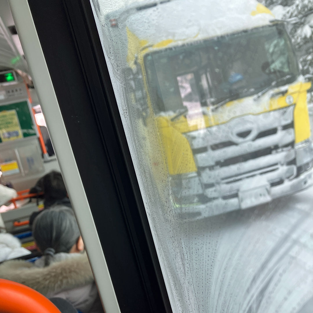 バスに乗り込み、雪に埋もれる浪岡(左、大きい画像)へは、5分遅れ位で到着。市バスも5分遅れ位で到着するも、そこからは、手に汗握る展開。両側を高く覆う雪壁。道幅は極限まで狭まり、トラックとすれ違うために(画像)バスが100mもバックするシーンや、スタックしかかることもありながら、28分遅れの10時2分に新青森駅南口へ到着。臨時のはやぶさ号の指定席を取り、発車4分前に滑り込む。仙台では、5分で新白河行き新幹線に乗り換えることができた。盛岡寄りを断念したこともあり、当初の予定より1本早い新幹線で新白河に着いた。運にも恵まれ、昨日・今日とナイスな決断だったと思う。