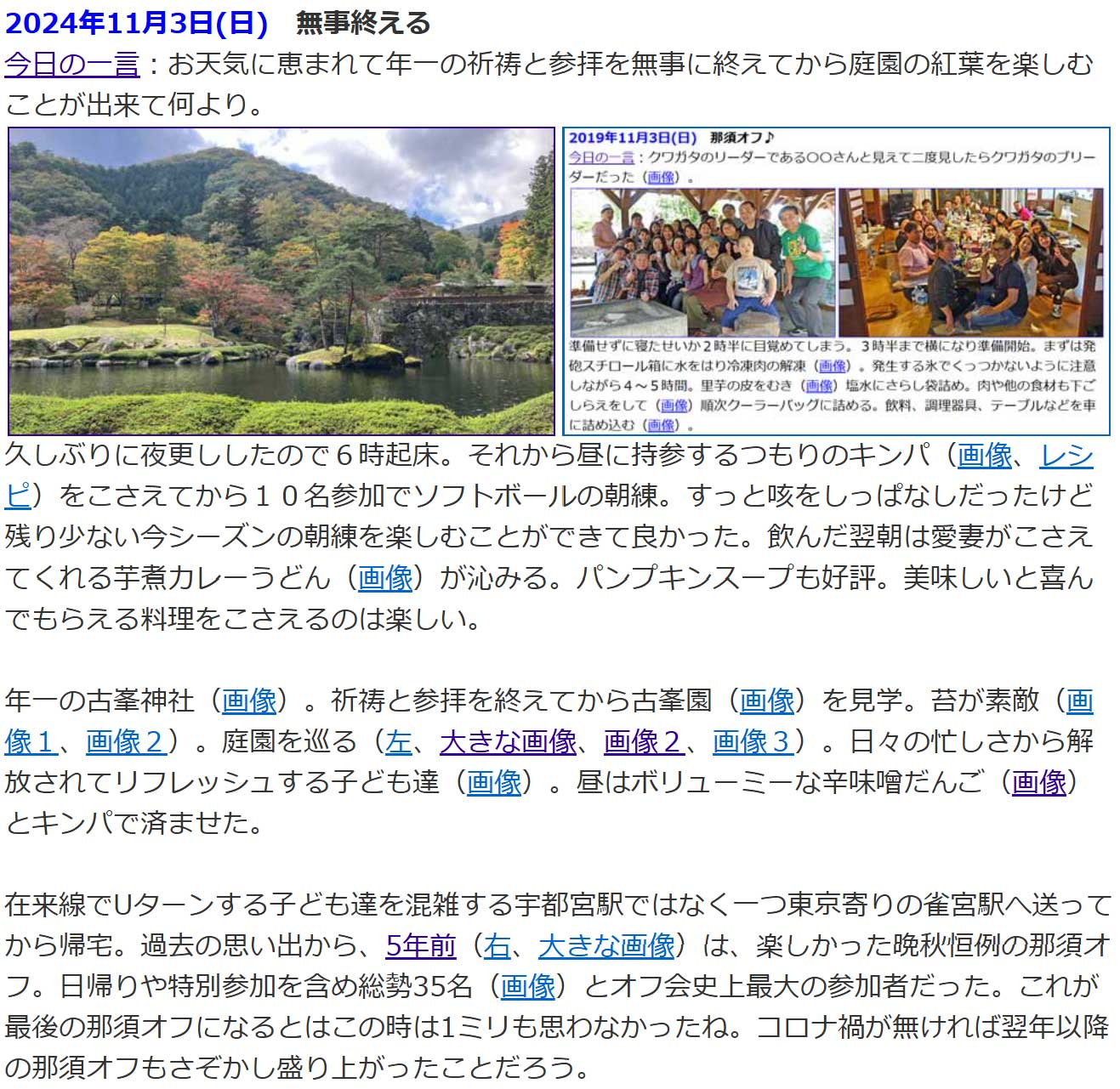 雀宮駅で娘と息子&孫をピックアップして毎秋恒例の古峰神社へ参拝(左、大きな画像、画像2)。昨年は11月3日だった(画像)。ラキと孫(画像1、画像2)。得意のポーズ(画像)。夜は四角いピザを焼いた(画像)。