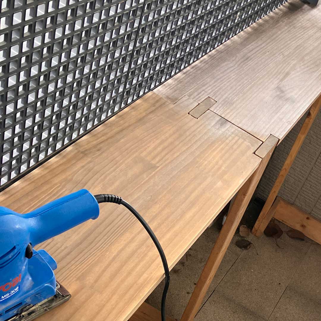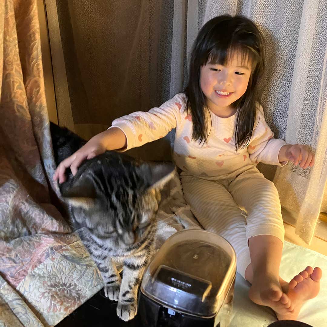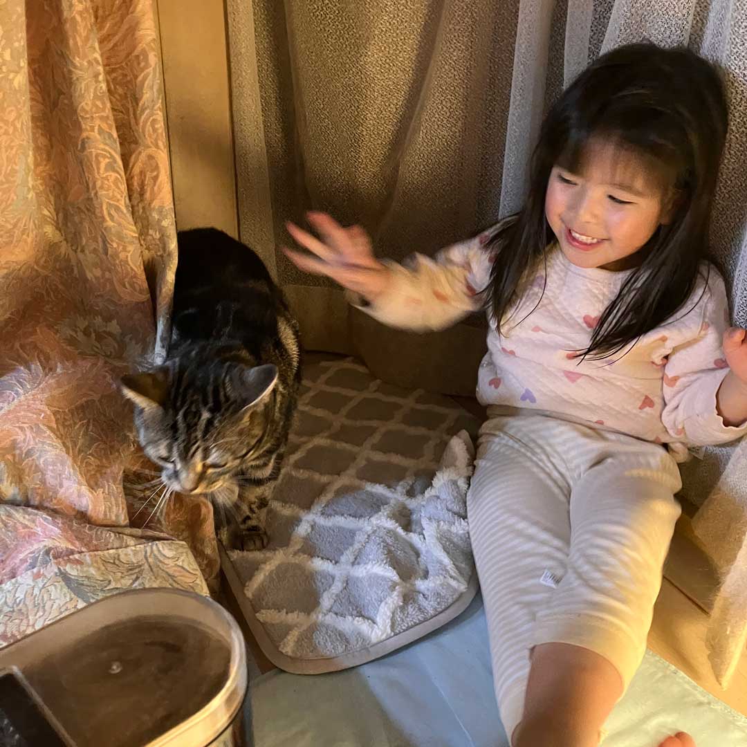 帰宅してサンダーに#180のヤスリを取り付け(画像)。サンダーをかけると見た目がだいぶ違う(画像)。保護剤を塗り(画像)使ったローラーを水洗い(画像)。ハンギングチェアの猫たち(画像)。お昼寝のラキ(画像)。ホウレンソウの和え物(画像)とバーミキュラユキヒラで大根と油揚げの味噌汁をこさえた(画像)。昼はシンプルうどん(画像)。掃除機がけをして後は夕食でリクエストされているチャーハンをこさえるのみ。