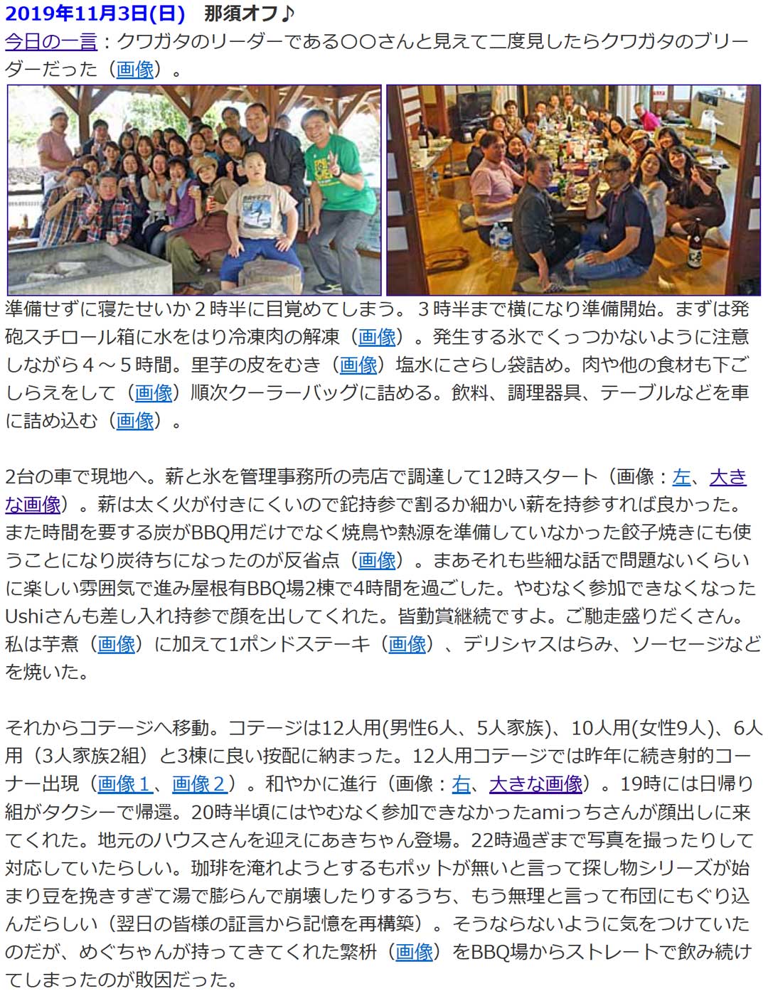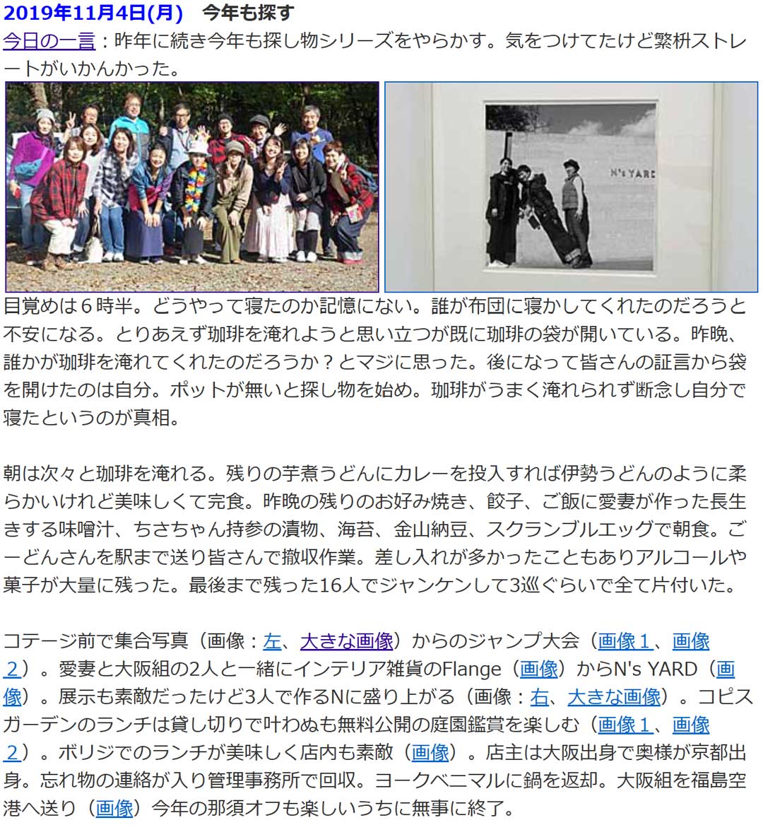 帰宅してから残りのかぼちゃを使いパンプキンスープをこさえた(画像)。バナナと牛乳が残っていたのでバナナのパウンドケーキ(左、大きな画像、材料)。材料はもう少し調整が必要。クッキングシートが切れていて型にくっついたケーキを剝がすのにビジュアルはイマイチになってしまったけどまあ素朴に美味しくはある。過去の思い出から、6年前(右、大きな画像)は、那須オフ。俺は幸せだを口に飲まれてしまいがちw。まだ続くと誰もが思っていたけど最後となったね。