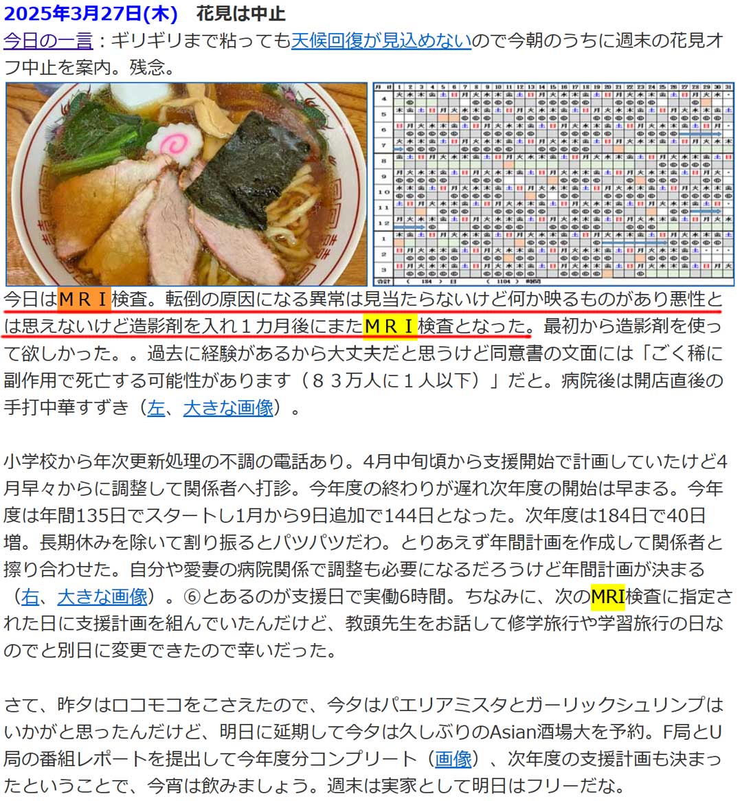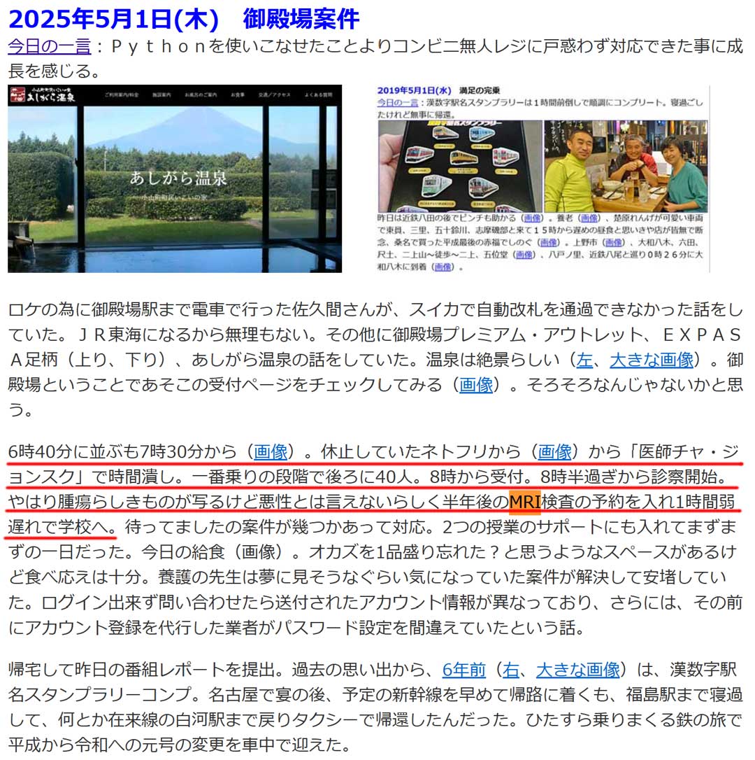 2月に倒れ救急搬送されてから検査三昧の最後が3月27日(画像)の頭部MRI。翌月4月25日(画像)に再検してさらに5月1日(画像)にも撮影して特に異常はなく念のため半年後にもう一度が今日。終えてから最遠の中学校だけど給食に間に合うかなw。教頭先生からは休んでもと言って頂いたけど休むと代替日の調整が面倒になるので休まずに時間調整が望ましい。