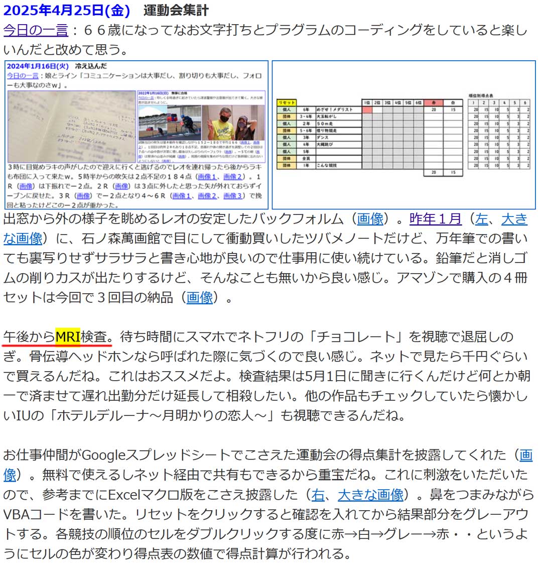 7時40分に病院の待合室に75番目位で座る。8時から自動受付機3台でさくさく受付が進み8時5分に受付完了。血圧測定を済ませ脳神経外科待合に移動。8時12分にスタッフに診察券と血圧測定結果を渡しMRIの準備待ち。8時50分に声がかかりMRI検査室へ移動し9時20分に検査完了。9時50分に診察室に呼ばれ右脳の影は変化無しで半年後に再検。それでも変化なければ次は1年後と言われて終了。10時5分に次回(5月)のMRIスケジュールが決まる。会計を終えて10時40分。学校には11時半到着で無事に給食w(画像)はネギ満載味噌汁。撮影後、用務員さんから里芋の煮っころがしのお裾分け。美味しい。前回、Word2段組みファイルからExcelに問題抽出するVBAマクロをこさえたので、今回は、Excelから問題順番をランダムに変更してWord2段組みファイルに出力するVBAマクロに挑戦。帰る頃になり9割方完成。次回で完了しそう。