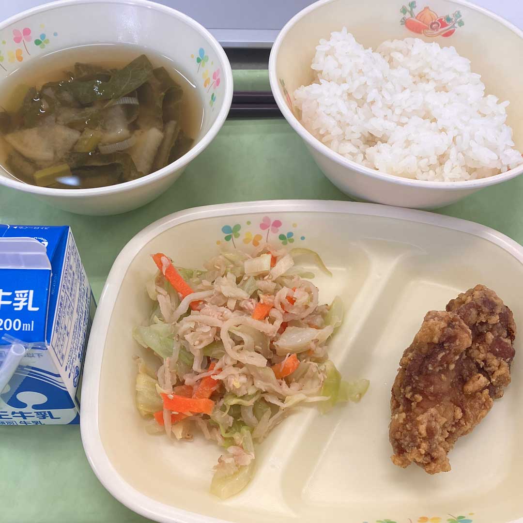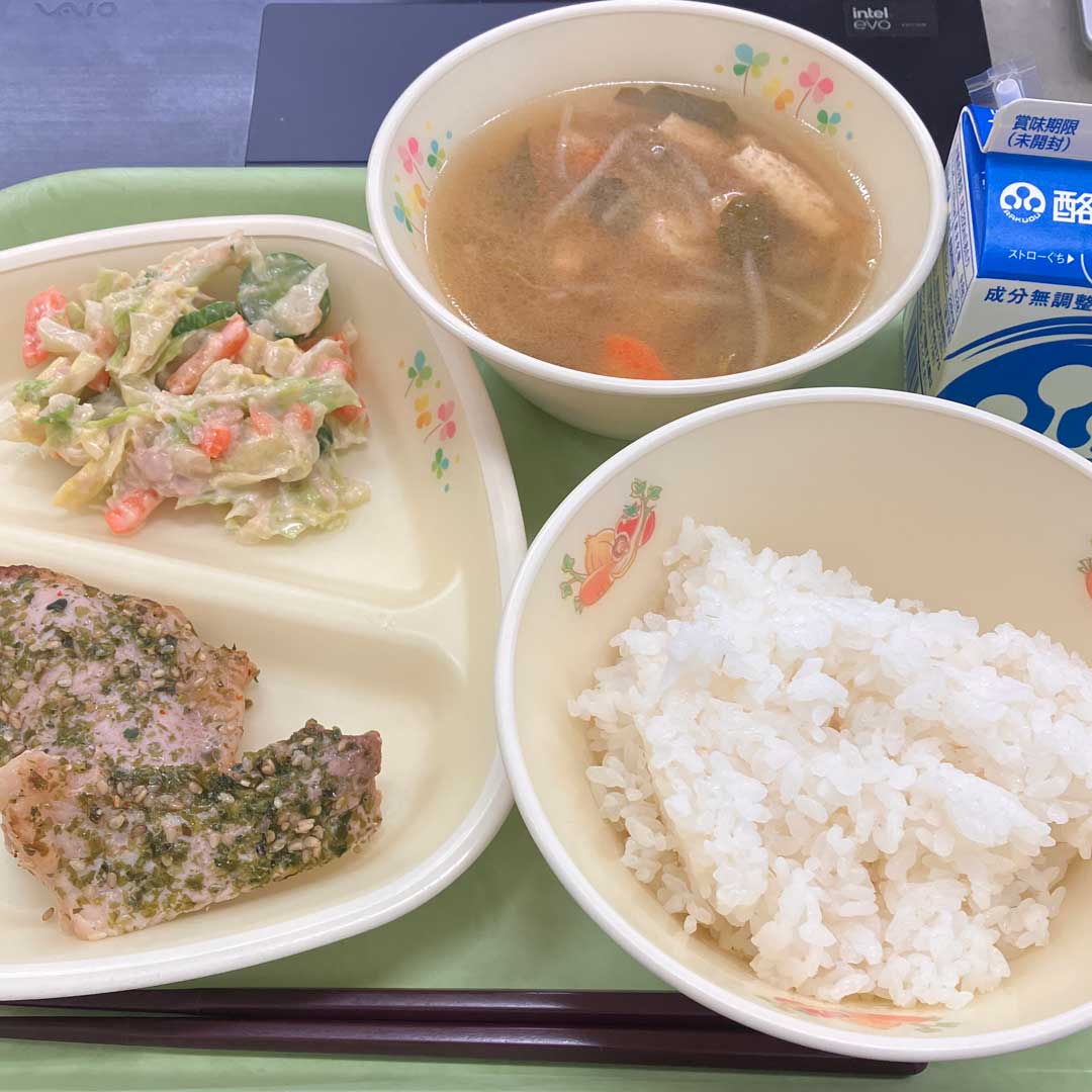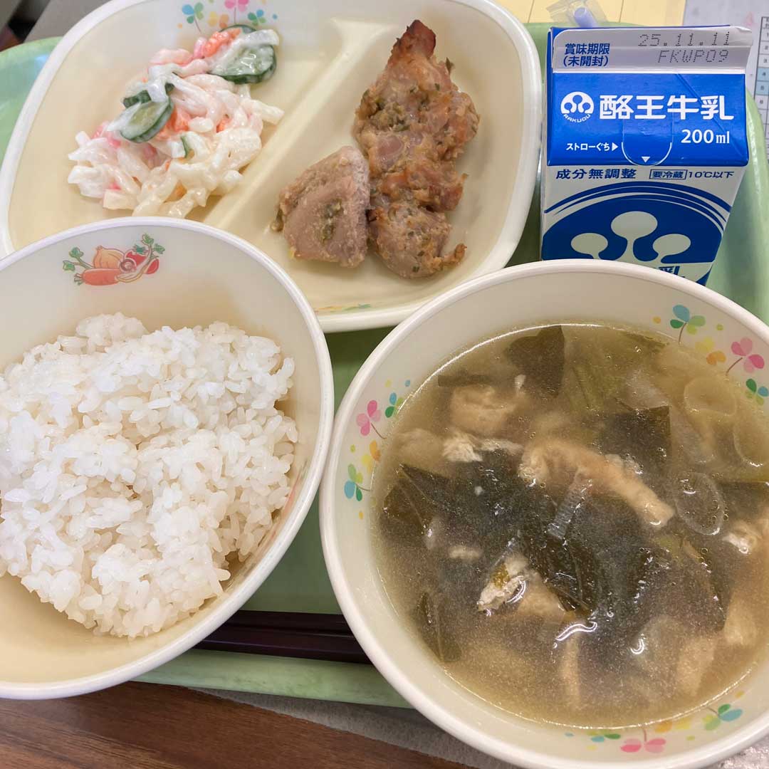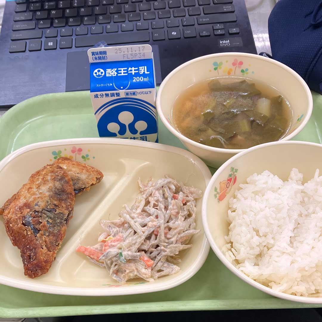 水木を終えホッとする金曜。気候も穏やかで癒しの風景(左、大きな画像)。朝一でQRコードの作成依頼がある。勝手に校章を入れたいと思い準備していたので念願叶う。誤り訂正率30%でQRコードをこさえ白縁取りした校章を誤り訂正でカバーできるサイズで配置するのみ。Teamsで視聴者1人のオンライン授業配信が不安定と相談を受け、Google Meetの方がオススメかと思ったので、Meet、Teams、Zoomの比較資料をこさえた。校務支援システムに生徒のアカウント登録依頼が流れてきたので実施。給食(画像)。月~水て3日連続ネギありだったけど木金はネギフリー。