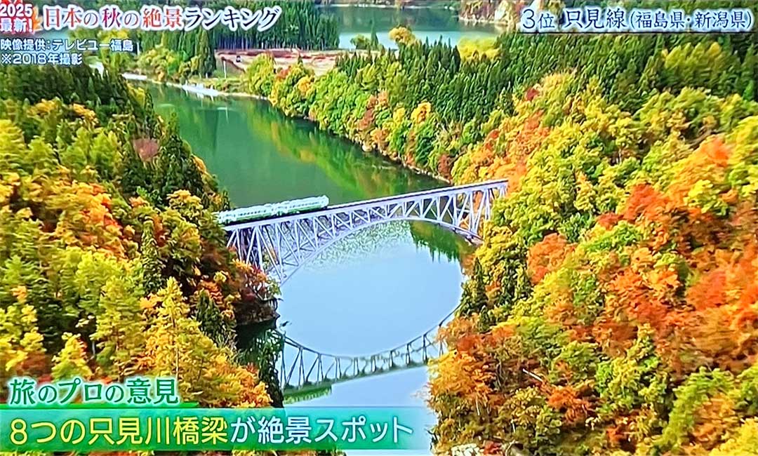今日の一言だけど支援校で考えるとALTの先生が居るから教職員に占める外国人人口比率は3~5%。オイラが居るから高齢者人口比率も同じく3~5%w。Qさま~の番組で旅のプロが選ぶ日本の秋の絶景ランキングベスト15を視聴。ランキングは①奥入瀬渓流②嵐山③只見線④日光⑤宮島⑥東福寺⑦鳴子峡⑧メタセコイア並木@滋賀県⑨保津峡⑩黒部峡谷⑪上高地⑫永観堂⑬北大イチョウ並木@北海道⑭香嵐渓@愛知県⑮高千穂峡。秋に限らず行ったことがあるのは①②③④⑤⑥⑦⑨⑩⑫⑮で11/15≒73%。県内の只見線が3位(左、大きな画像)は嬉しいけど県内からでも遠すぎる。