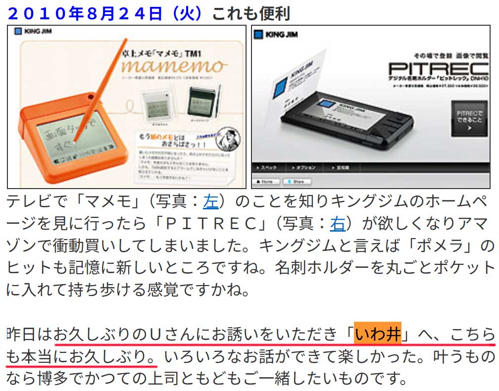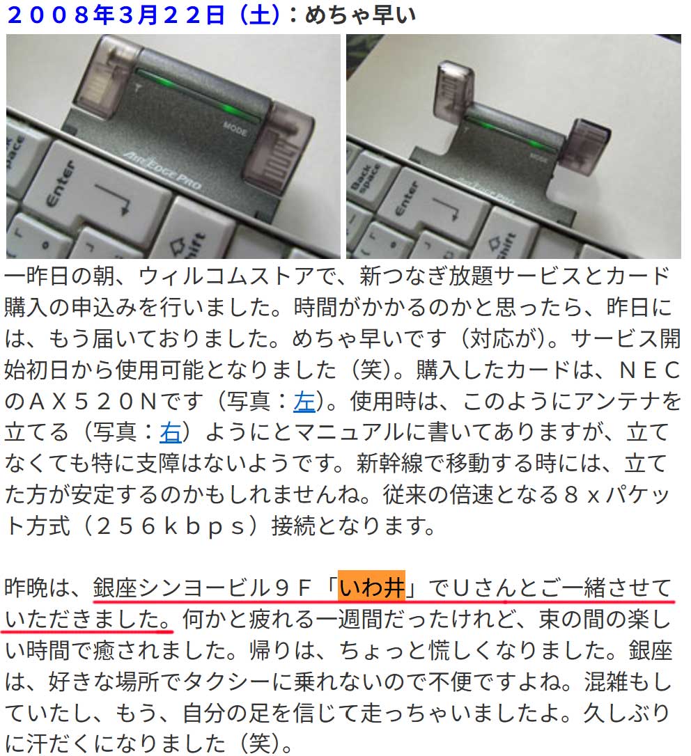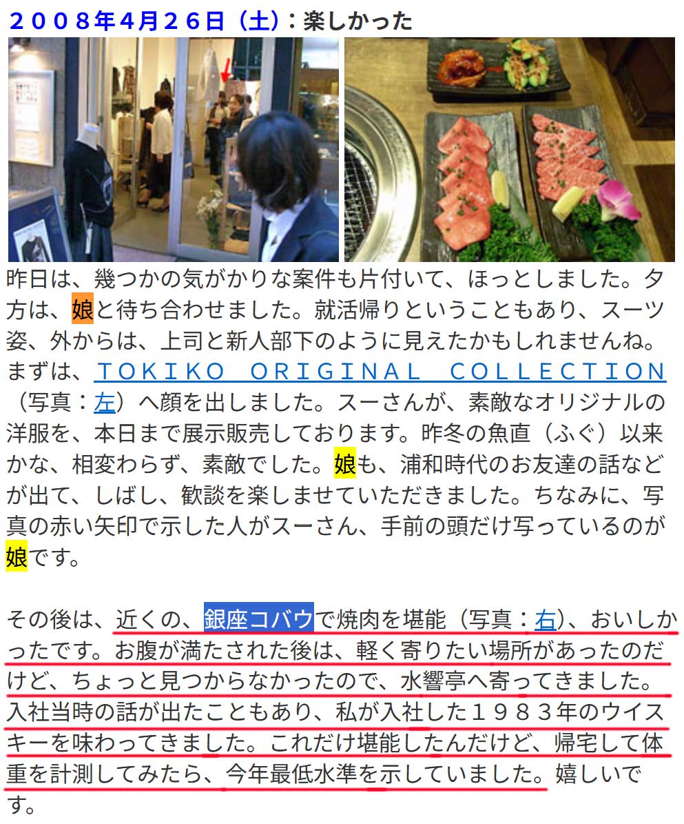 佐久間宣行さんのANN0も聞いた。あのちゃんが佐久間さんの「がははは」笑いを真似するけどオイラの第一印象もそこなのでウケる。佐久間さんのお話は面白い。時々話す家族ネタも好き。娘さんの高校時代の弁当を手作りされてたのには驚いた。学生になった娘さんのリクエストでトリキ日比谷店に行った話をされてた。18歳と49歳と言えば自分と娘の年齢差とほぼ同じ。17年前(右、大きな画像)に、銀座で娘と焼肉後に寄りたい場所が見つからず水響亭に行ったとある。うーんと考え絞り出した店名は「いわ井」。前月(画像)に、U(上柳)さんとご一緒してたのに場所が分からなかったんだね。15年前(画像)に、Uさんと久しぶりにまた訪れていた。その間で娘を連れて行っているんだけどHP内検索でヒットしない。