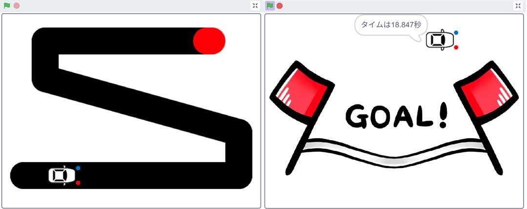 Scratchプログラミングの次作。昨年作成の黒線トレースを改良した。拡張機能のペンでコースを描かせてからトレースするようにした(動画)。進む歩数を増やせばタイムを縮められるけどある時点でコースアウトしてしまうので車前方のセンサーに見立てた青玉と赤玉がコースアウトした時の車の動きの改良が必要になる。最速タイムにチャレンジしてもらおうかと。