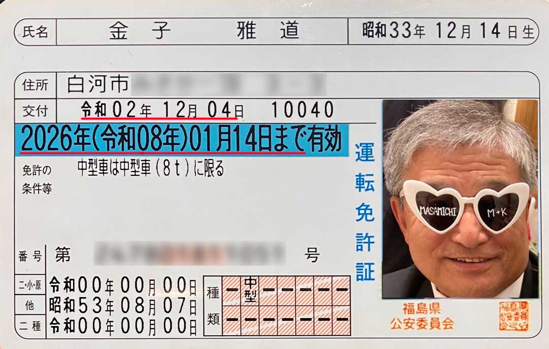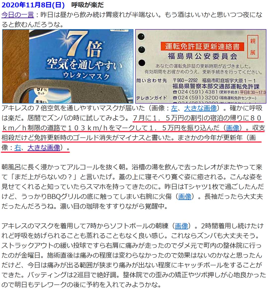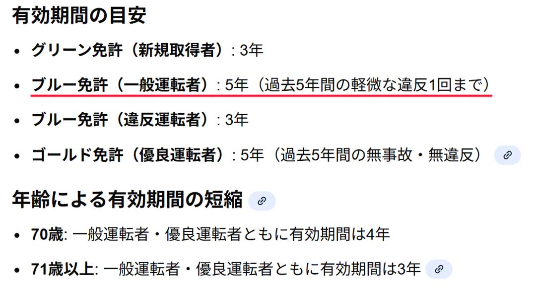 過去の思い出から、5年前(画像)は、夏に1.5万円割引の宿からの帰りに80km/h制限区間を103km/hで1.5万円の反則金を払いチャラの上に運転免許がゴールドからブルーになると。過去5年間で軽微な違反1回は有効期間5年(画像)。今年もまもなく更新だ(画像)。いつだったか食材調達で地元スーパーに寄る際に(画像)一時停止違反と言われ、またも軽微な違反1回なので次もブルーで5年間有効になるのか。さらに次の更新は71歳以上で3年になるんだわ。