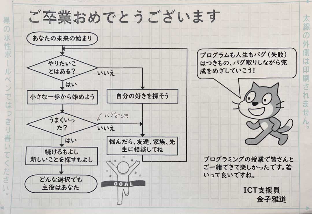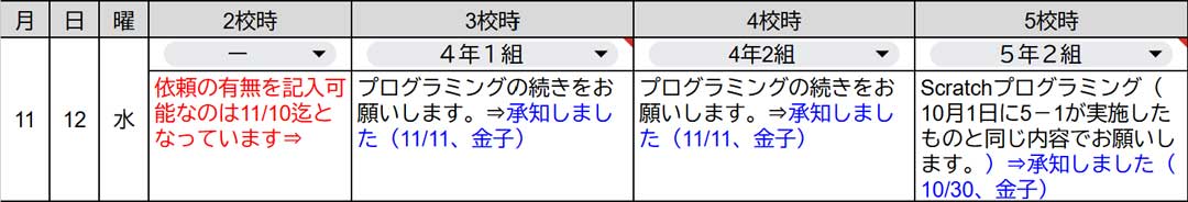 昨日のプログラミング授業は、3年2組向けに2回目、3年1組向けに3回目(右、大きな画像)。3回目ではバグ探しやタイムを縮める改良に挑戦してもらった。4回目以降の構想も出来ているけど、別案はどうだろうかと先生と意見交換したらその方向でやりましょうということで意見が一致したので次回までに準備しよう。他に特定Wi-Fiに繋がらない案件。プライベートアドレスを使用するがONになっていたのが原因、ONでも別のWi-Fiには繋がるから嫌らしい。教師・生徒が使用するGoogleアカウントでのパスワード失念案件。以前は学校代表アドレスで対応できたけど今は教師個人の教育用Googleアカウントでログインしてアプリから行うことになっている。先生が出張されたので机の上に操作資料を置いてきた。