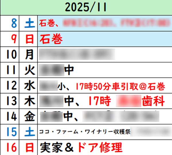 今月の担当番組14本中6本目を提出する朝。明日の授業依頼スプレッドシートをチェック(画像)。先週超過分があるので明日は5校時を終えた14時40分で早上がりし石巻に向かう。ディーラーが18時までで慌ただしいけど安全運転で行こう。明後日は学校お終えてから歯科治療、土曜はココ・ファーム・ワイナリー収穫祭、日曜は実家で内ドアの修理が必要(画像)。