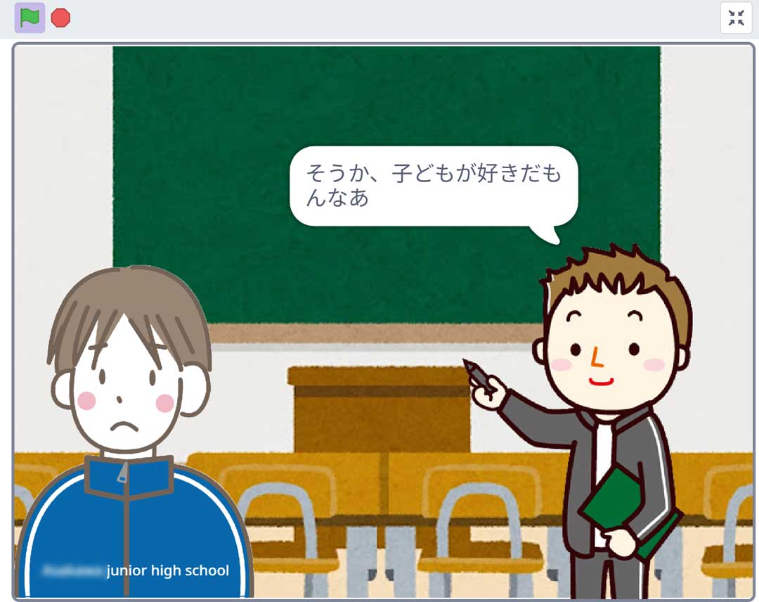 それから本日の中学校で3年2組向け4回目のプログラミング授業の資料まとめ。素材は準備していたので出勤前に何とか仕上げた。元々は別テーマで準備していたんだけど、新たな取り組みも出来ますよと先生にお話したらそれにしましょうとなり新たに準備することに。時間割変更で初っ端の1校時。まずは車故障の話、前日に学校の後で石巻まで車回収で準備をさぼり深夜にラジコを聞いたことは伏せて準備不足を反省するところから。今日から4回前後で取り組む内容を説明。ほんの1例をこさえてみせて(左、大きな画像)、資料配布、準備したサイトから教材ダウンロード。今日は個人ワーク、次回からグループワーク。3校時は3年1組向け3回目のプログラミング授業。2校時は2年1組、4校時は1年1組の技術のサポート。