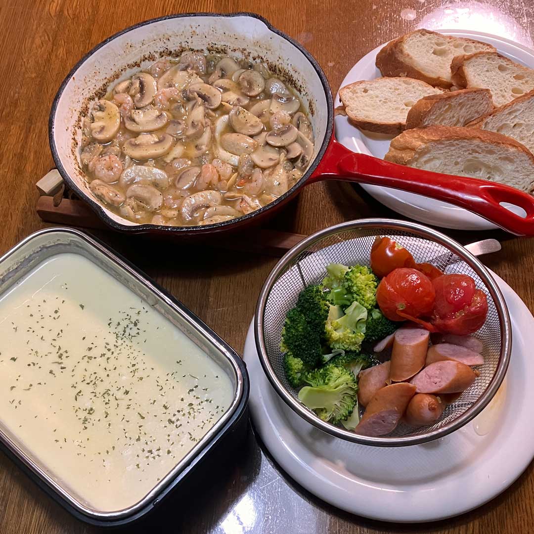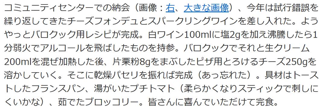 過去の思い出から、5年前(右、大きな画像)は、小名浜でテレワークを終え帰ればココ・ファーム・ワイナリーのオンライン収穫祭だと書いた。明日行くんだけど、7年前の収穫祭でチーズフォンデュ@バロックック(画像)を披露した。続くソフトボール納会でレシピ完成(画像)。海老とマッシュルームのアヒージョも良いね。純正品と同じ様に使えるかは不明だけど見つけた発熱剤代替品が昨夕届いたので現地で試してみるかね。